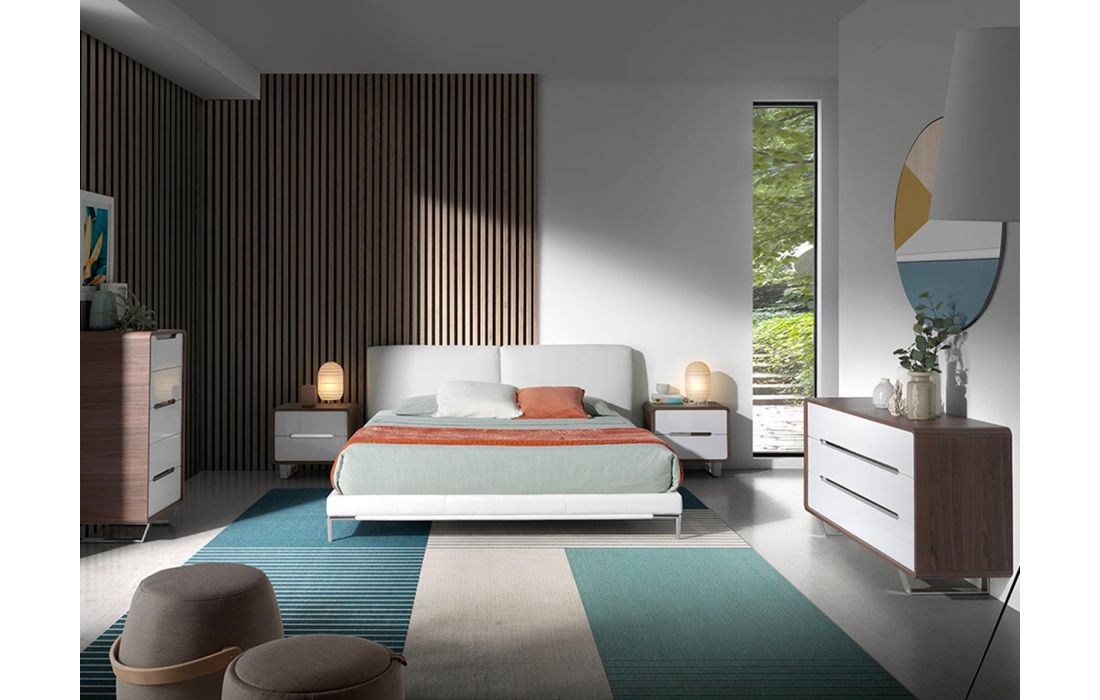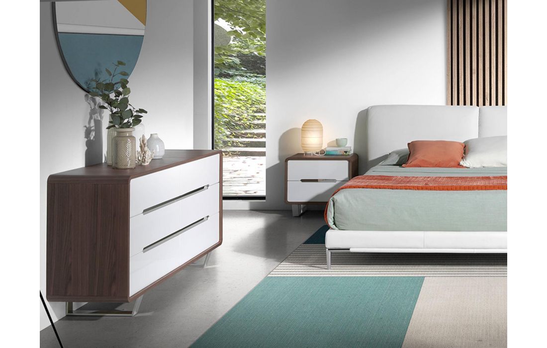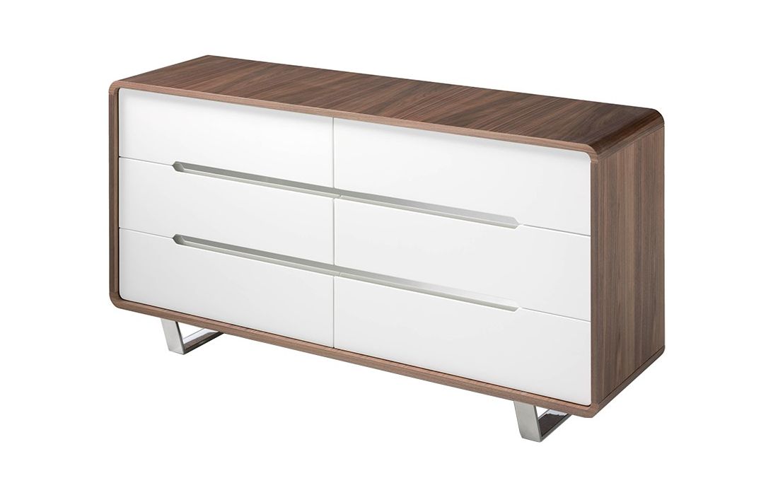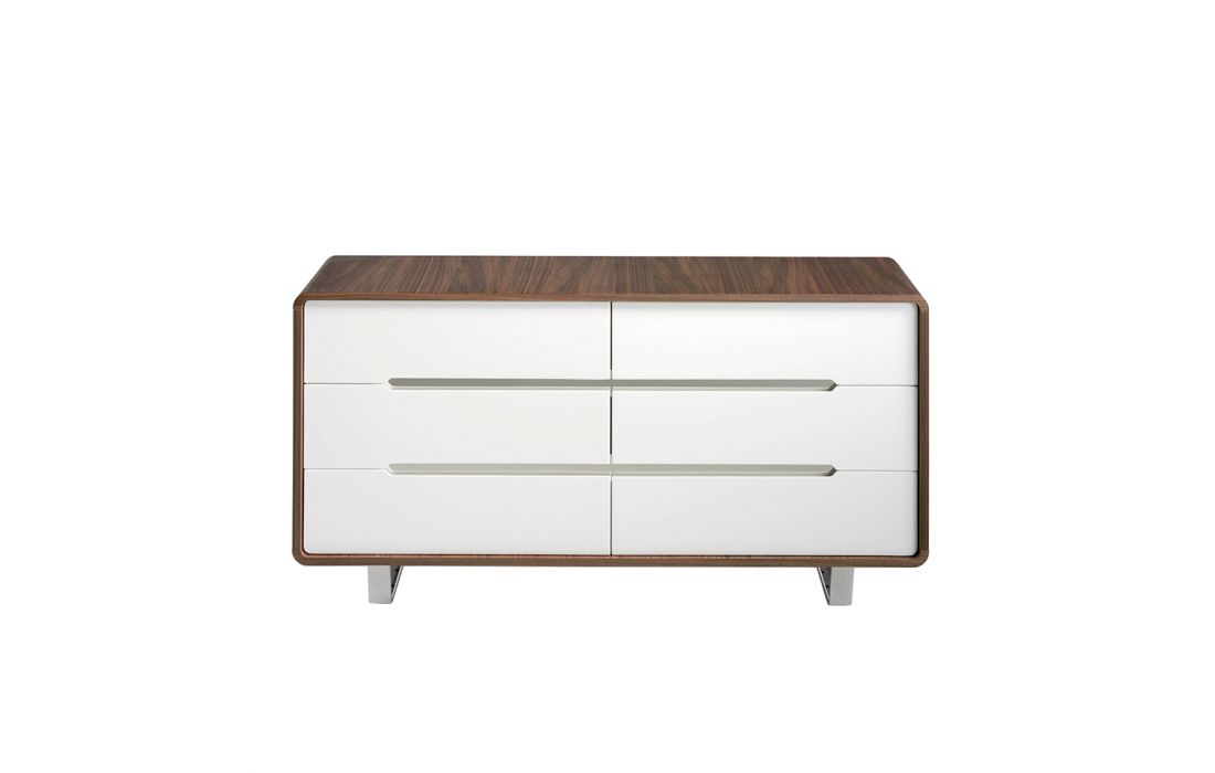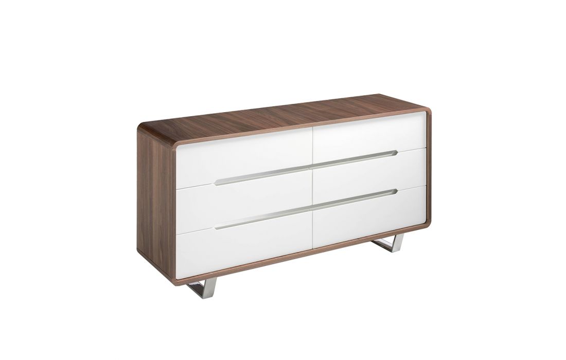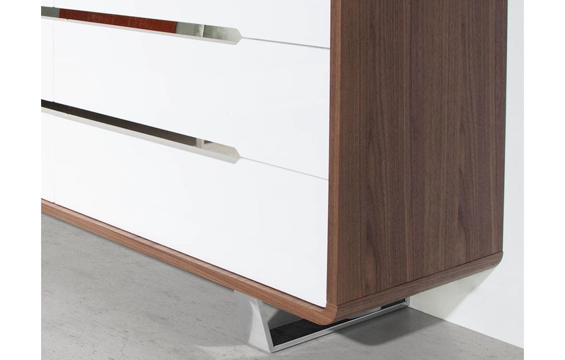Cómoda em madeira folheada a nogueira com seis gavetas em MDF lacado Branco Brilhante. Pés em aço inox cromado.