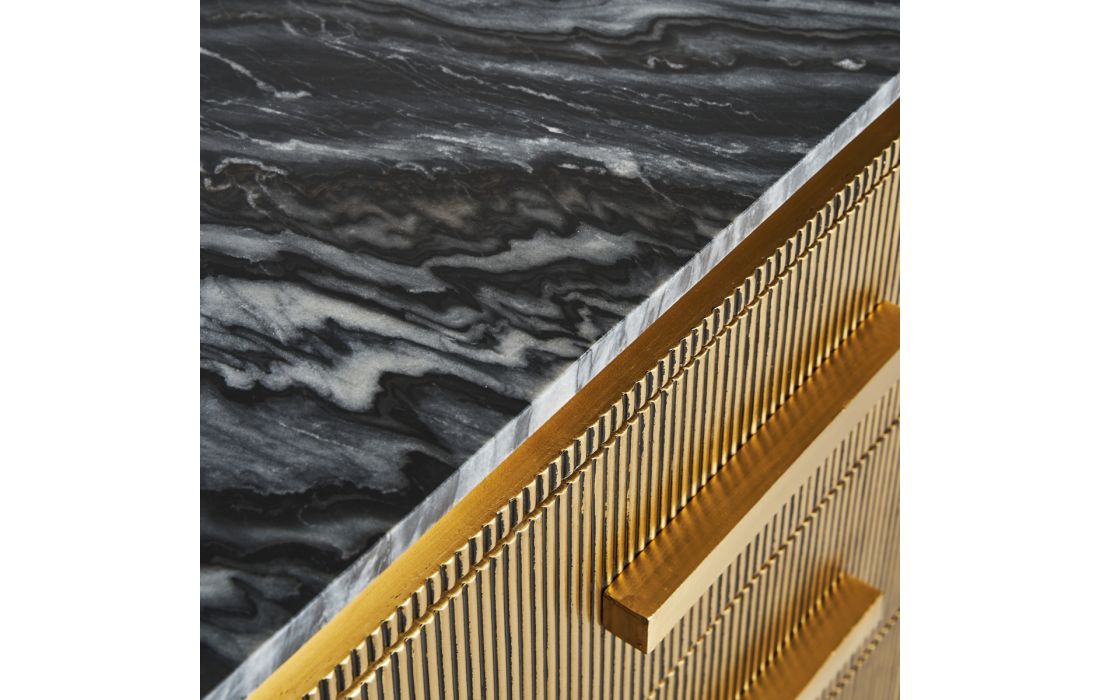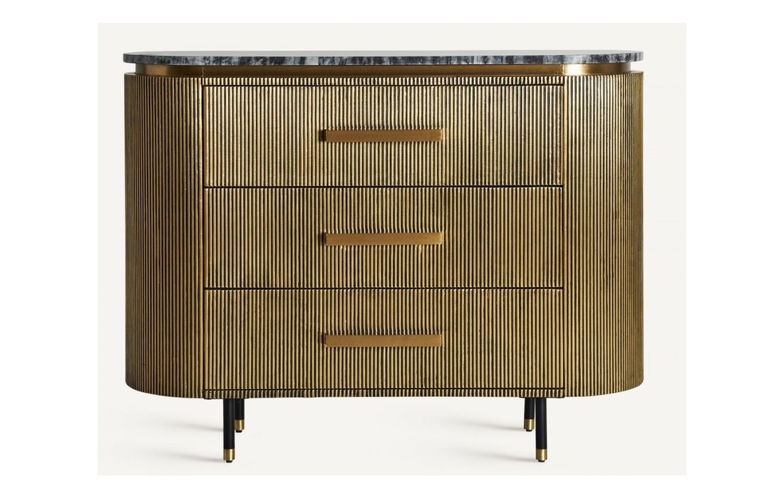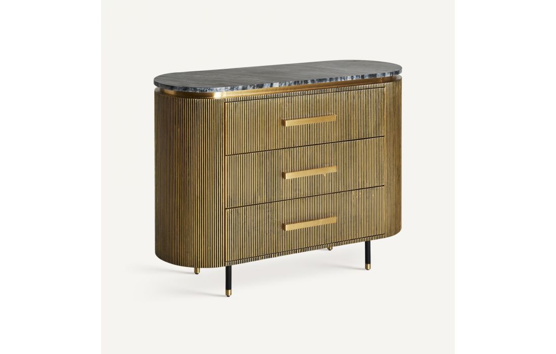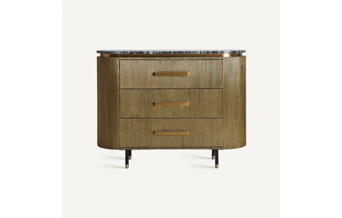 Cómoda em ferro dourado com estilo envelhecido , composta por 3 gavetas e o tampo em mármore.