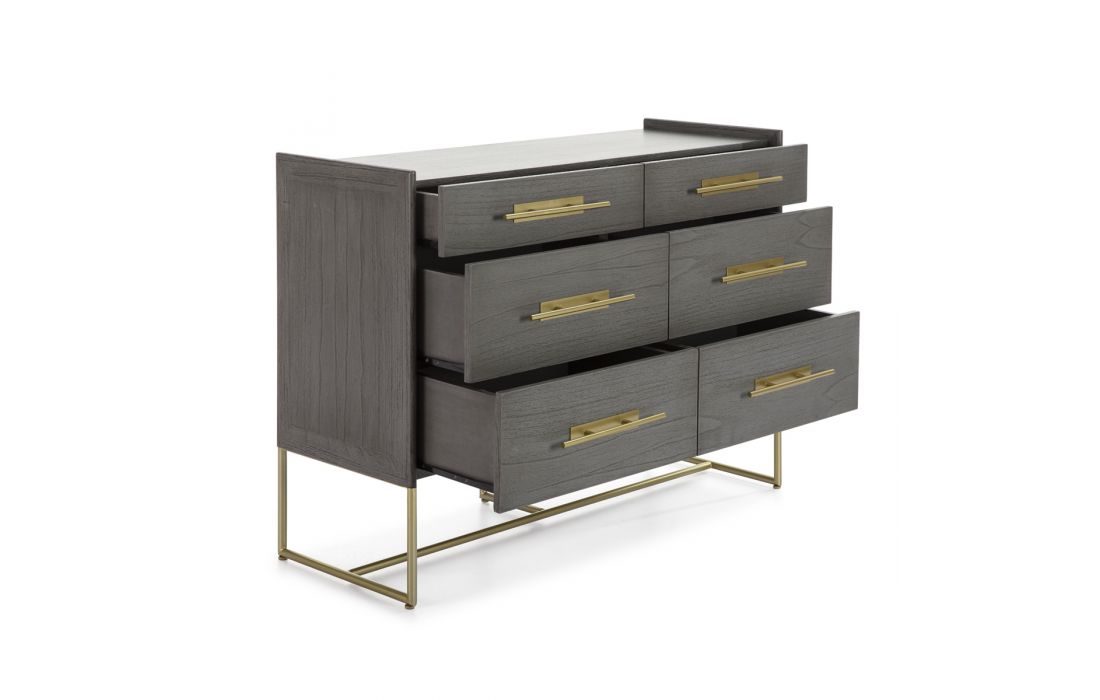 Cómoda com 6 gavetas em madeira de cor cinza, com base e puxadores em metal dourado.