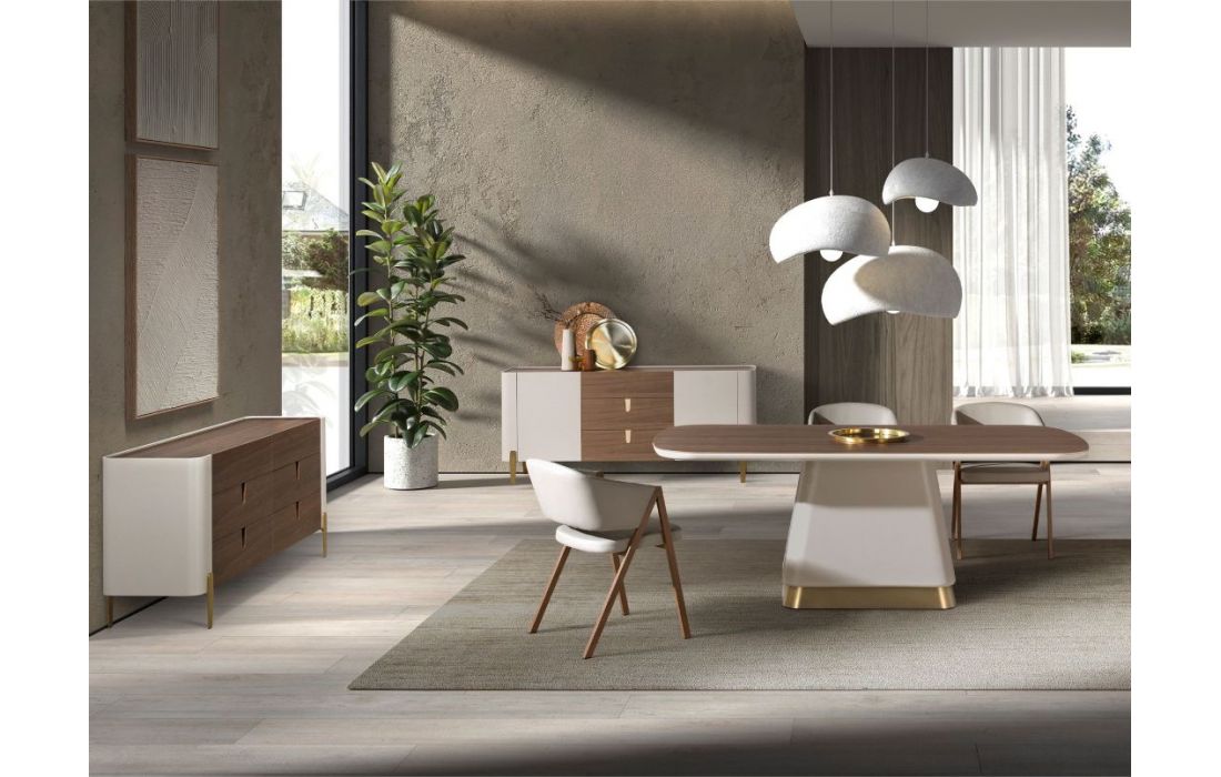 Cómoda de design moderno com MDF de nogueira e estrutura em MDF lacado, pés em aço inoxidável , com um detalhe original em aço inoxidável e dispõe de um amplo espaço de arrumação com 6 gavetasDestinatário :