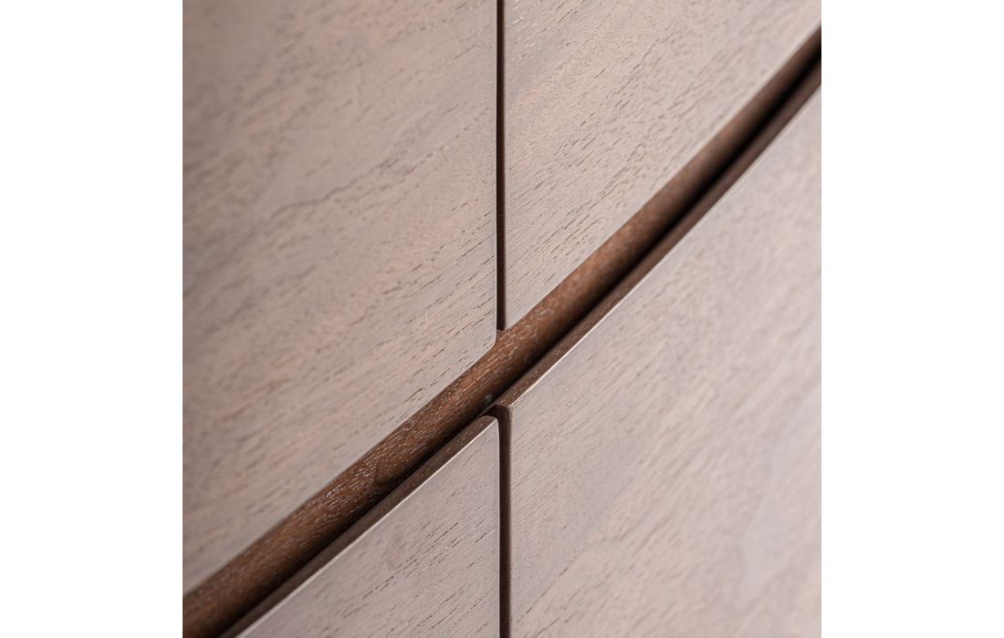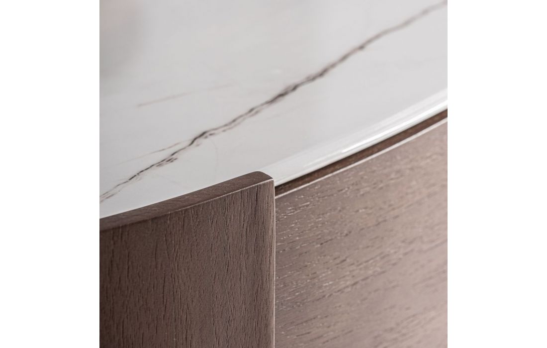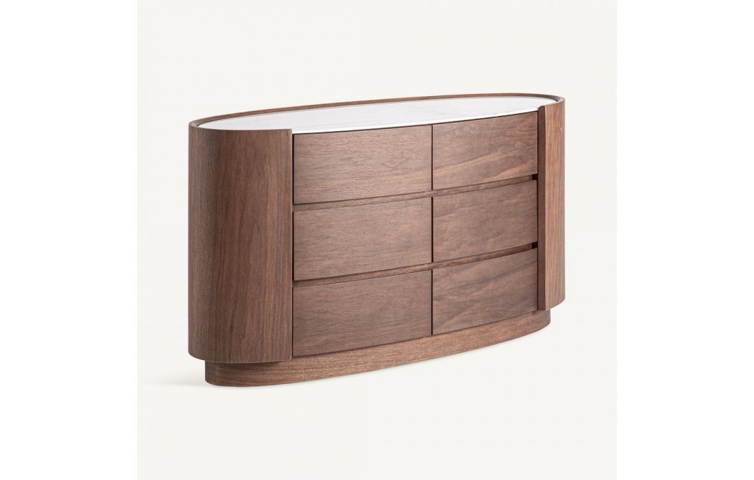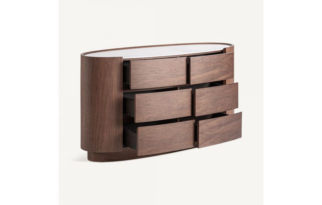 Cómoda feita de contraplacado castanho e folheado de carvalho, é complementada por um tampo de pedra sinterizada brancaDestinatário :