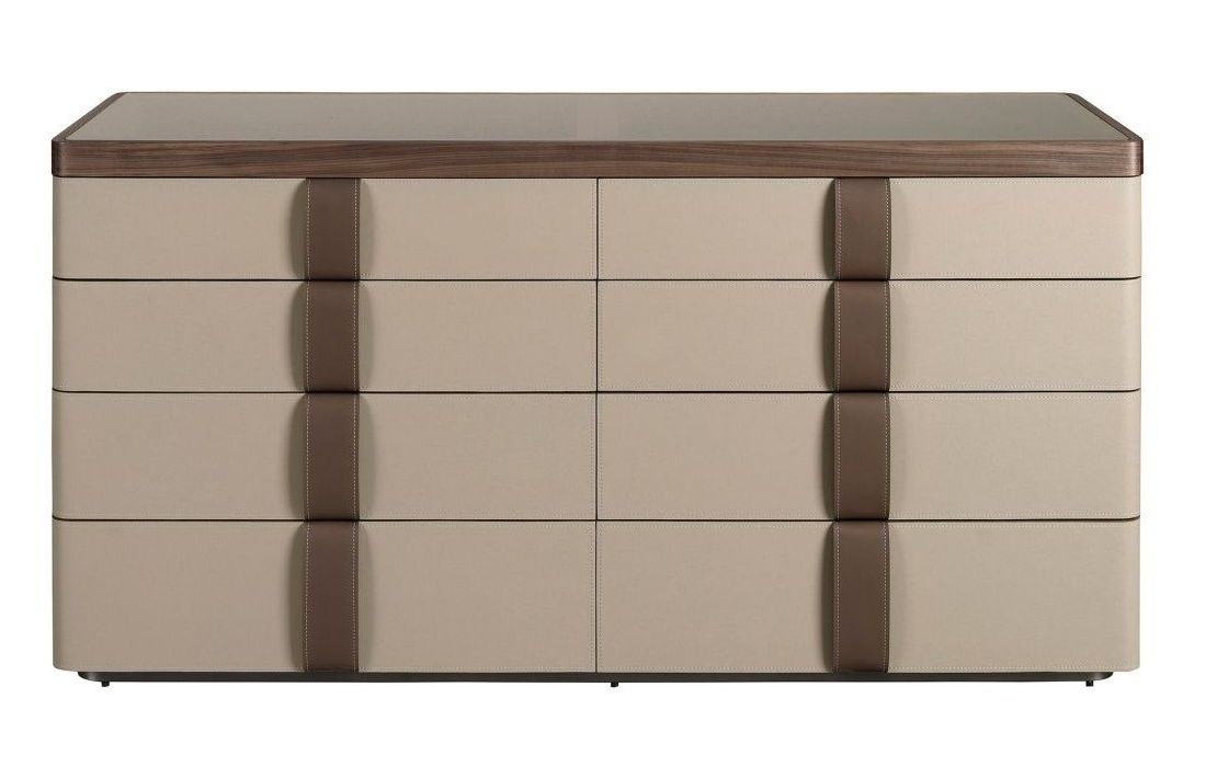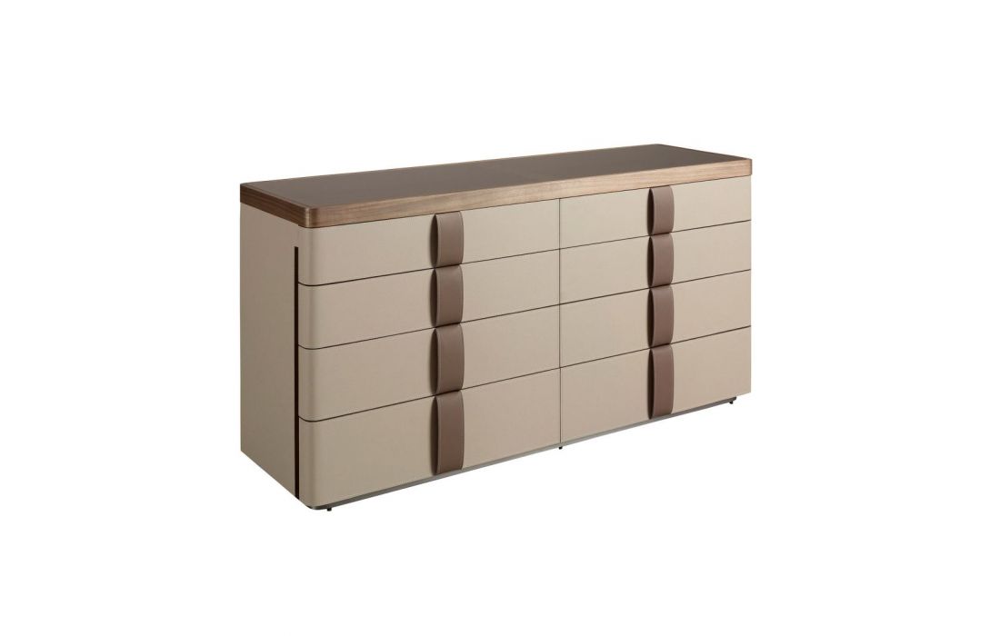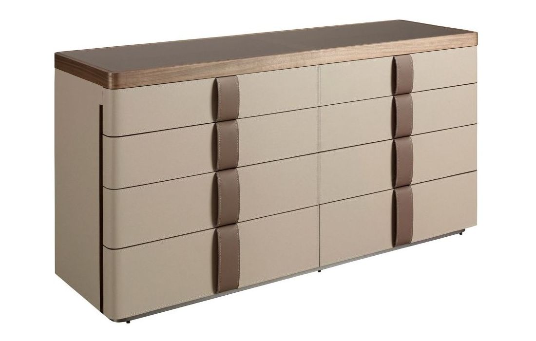 Cómoda de design moderno com estrutura em folheado de nogueira natural, estofada em pele de bovino e base original em aço inoxidável, com o seu elegante tampo em vidro fumado castanho, conseguirá o aspeto sofisticado que procura para os seus ambientes, possui um amplo espaço de arrumação com 8 gavetas com abertura por puxador e fecho suaveDestinatário :