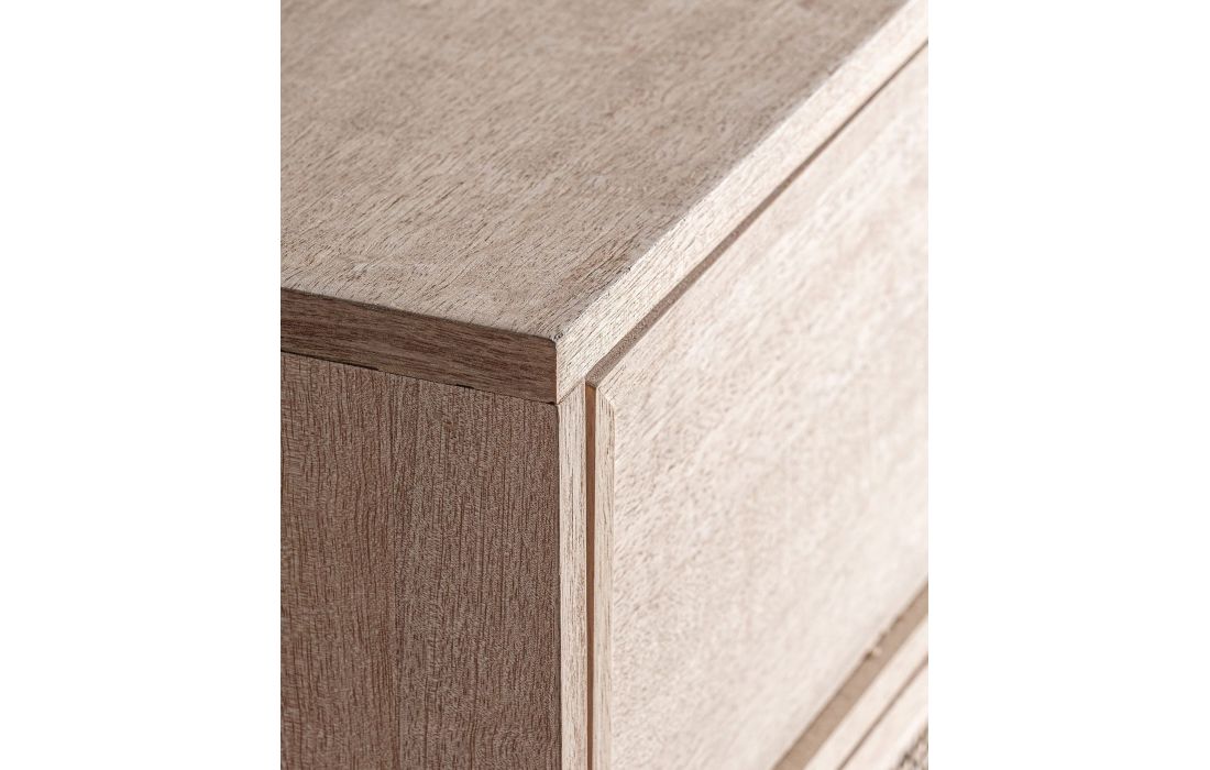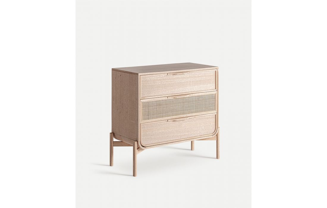 A CÓMODA WEURTZ em Madeira de freixo com palhinha, perfeita para quartos modernos. Seu design inclui gavetas espaçosas, ideais para armazenar roupas e acessórios, combinando funcionalidade e estilo natural.
