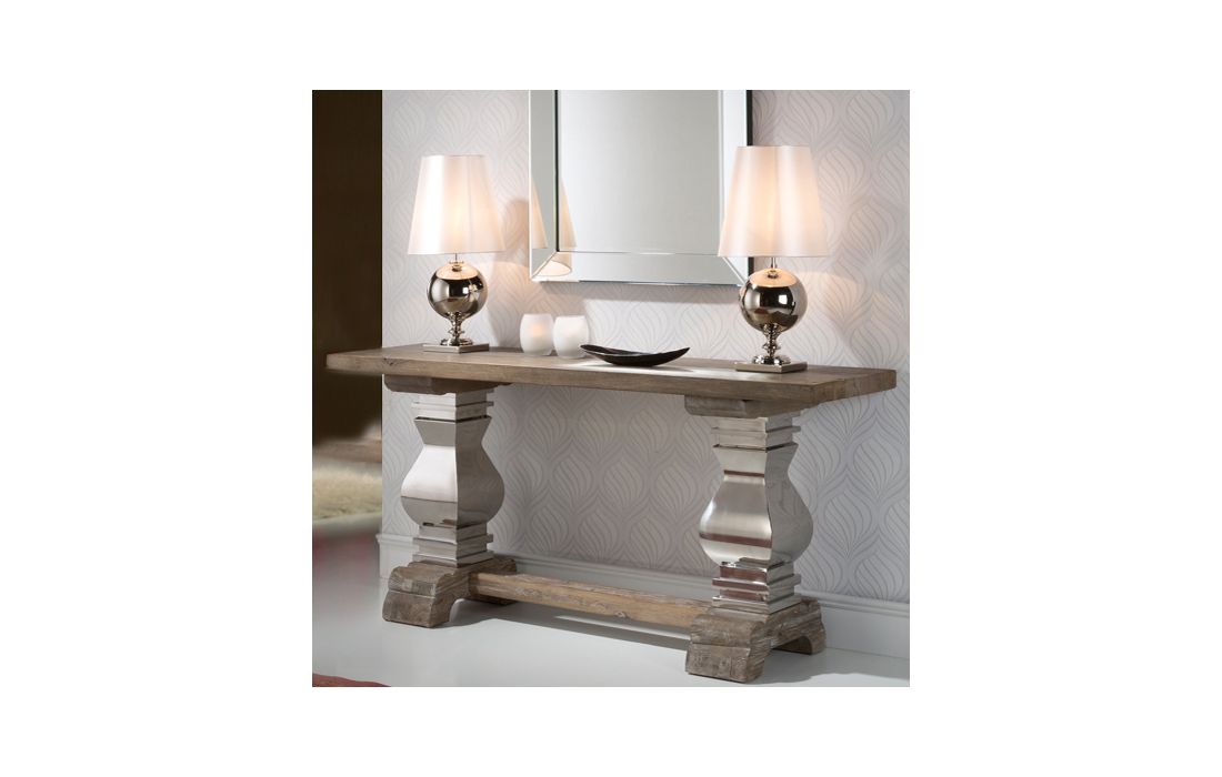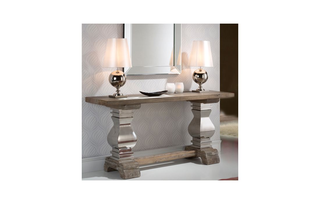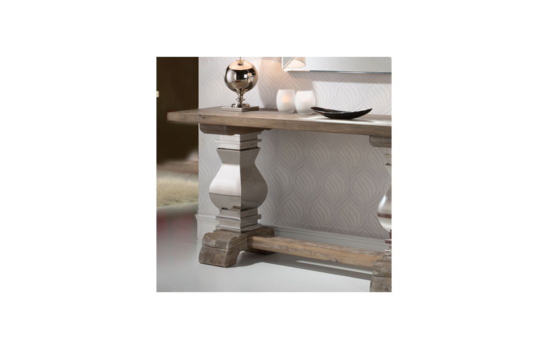 Consola em madeira maciça de freixo, envelhecida com pátina branca e pés em aço polido