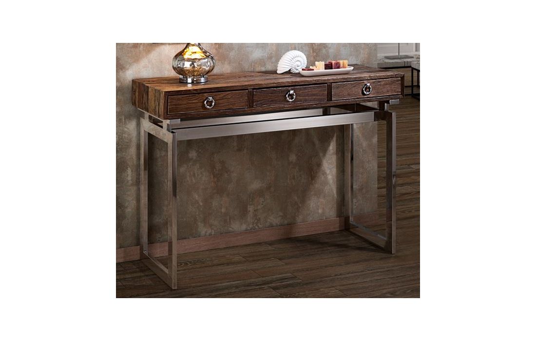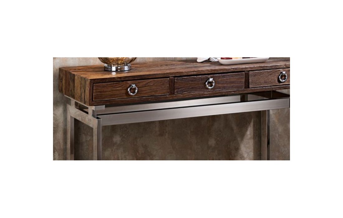 Consola em madeira e aço inoxidável, três gavetas com puxadores cromados. Madeira de olmo antigo, acabamento rústico.