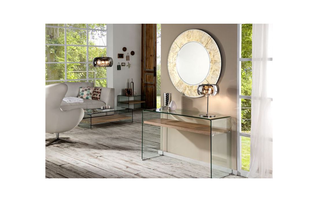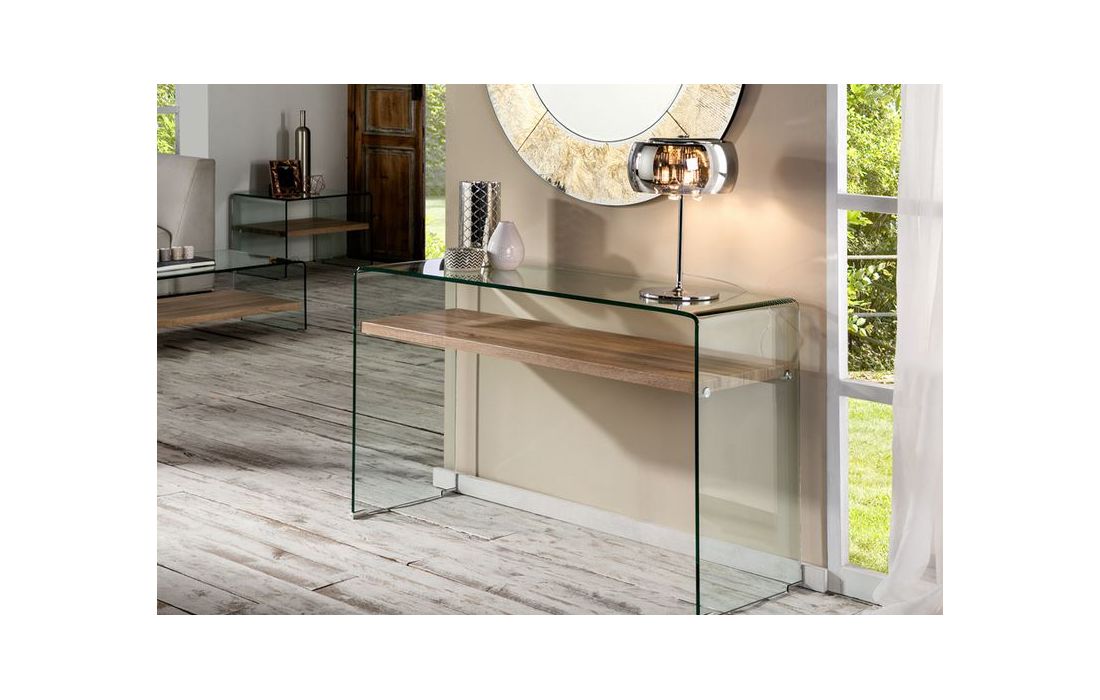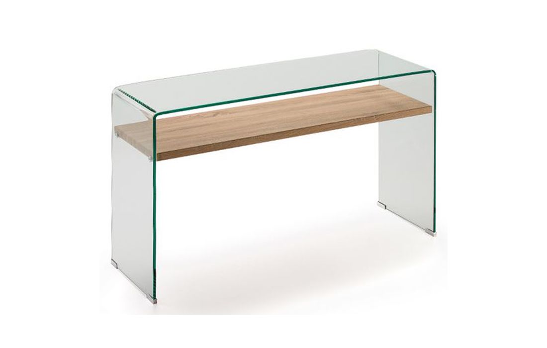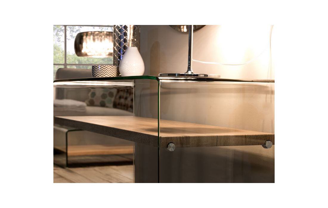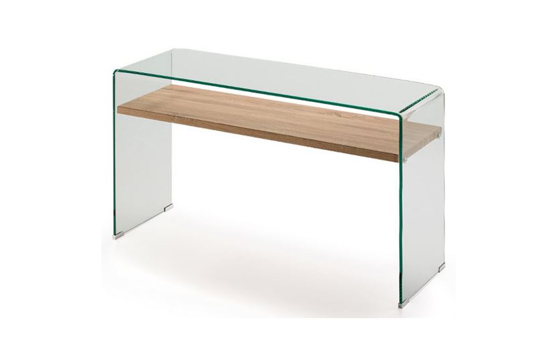Consola de vidro temperado e curvo de 10mm com prateleira em melamina folheada.