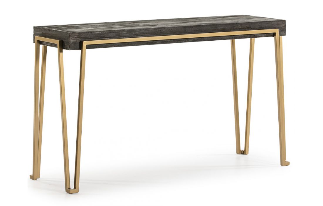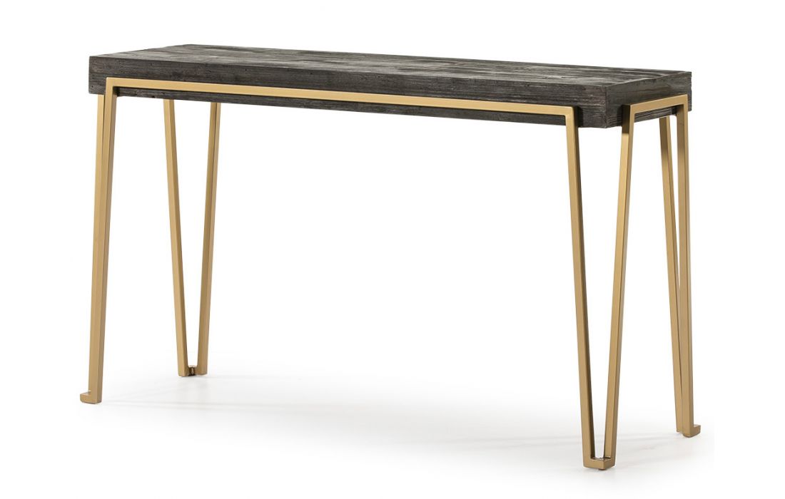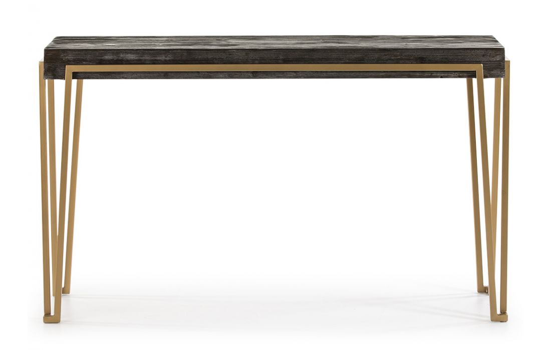 Consola com estrutura em metal dourado e tampo de madeira cor escura.