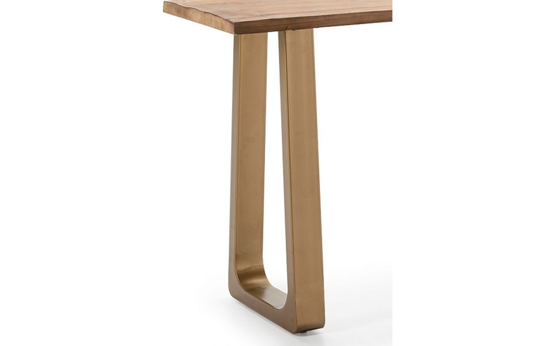 Consola com estrutura em metal e tampo de madeira cor natural.