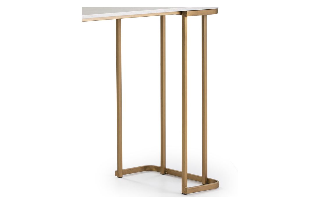 Consola com estrutura em metal e tampo em marmore de cor branca.