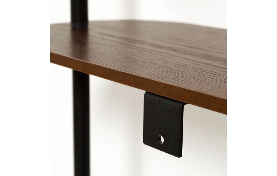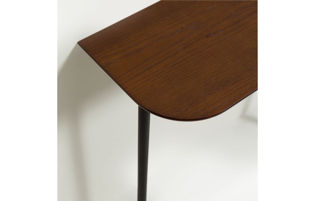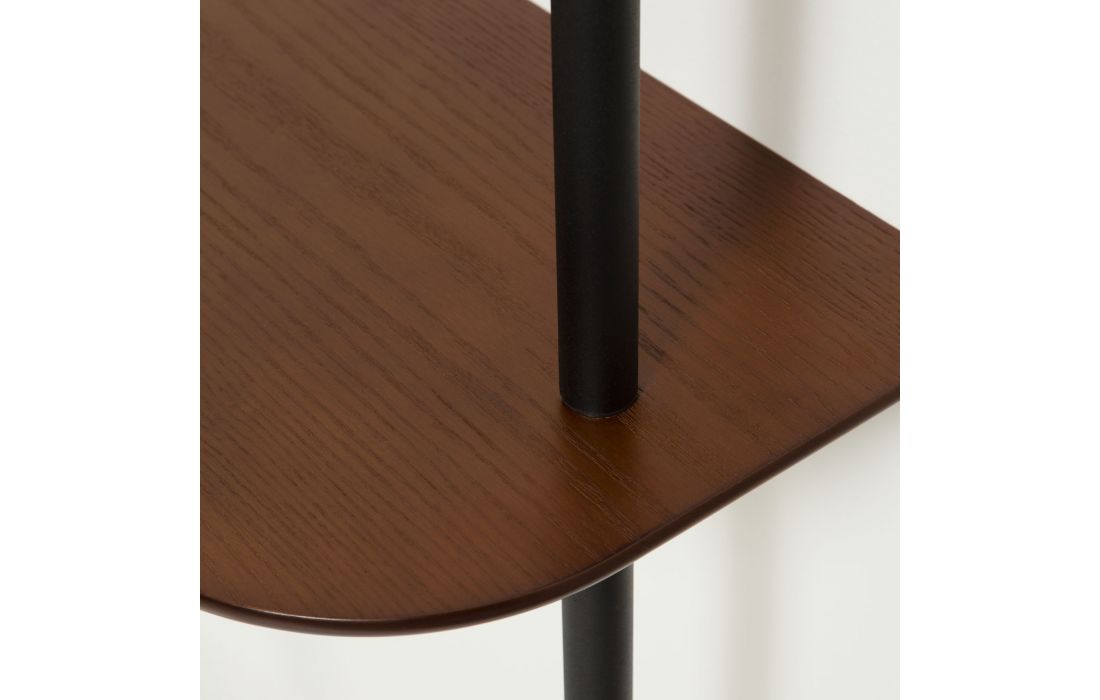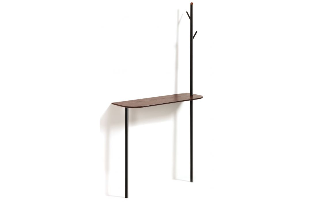 Consola com estrutura em metal pintada cor preta mate e tampo folheado de carvalho com acabamento cor de nogueira. Possui um cabide em metal embutido no lado direito da consola.