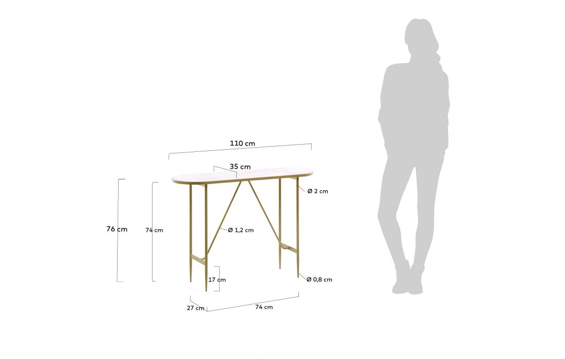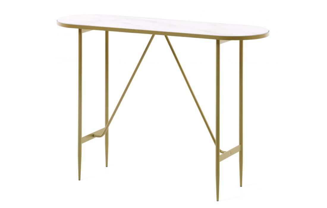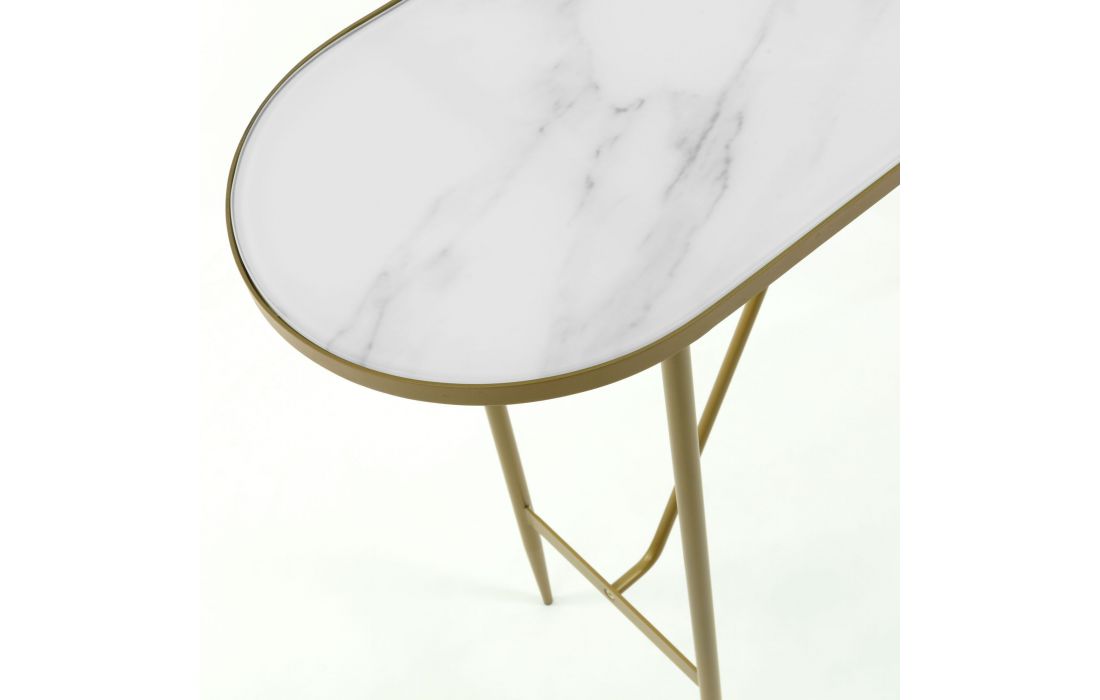 Consola com estrutura em aço com acabamento dourado e tampo oval de vidro temperado, debaixo do vidro há uma folha com acabamento em mármore que lhe confere um toque diferente e elegante.