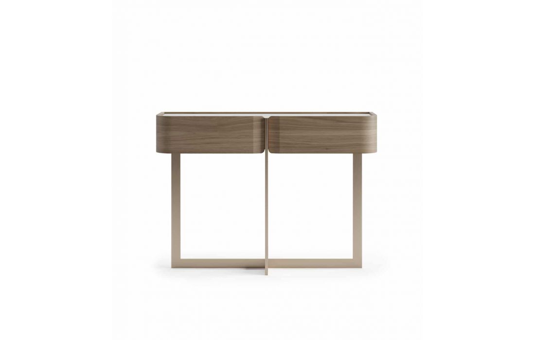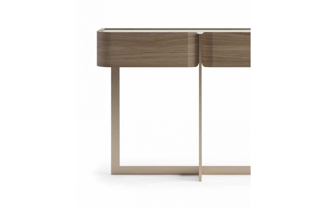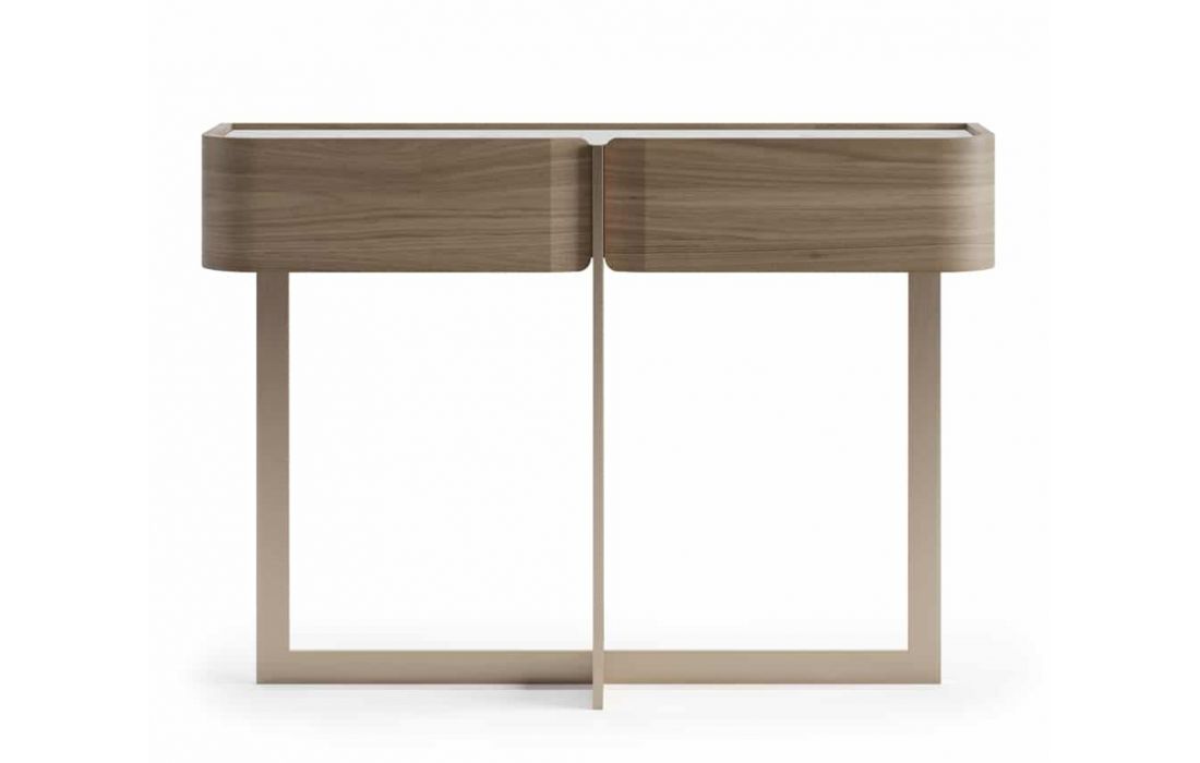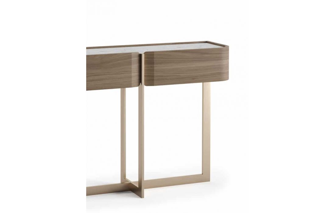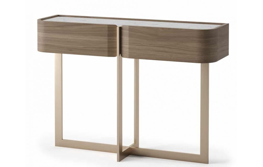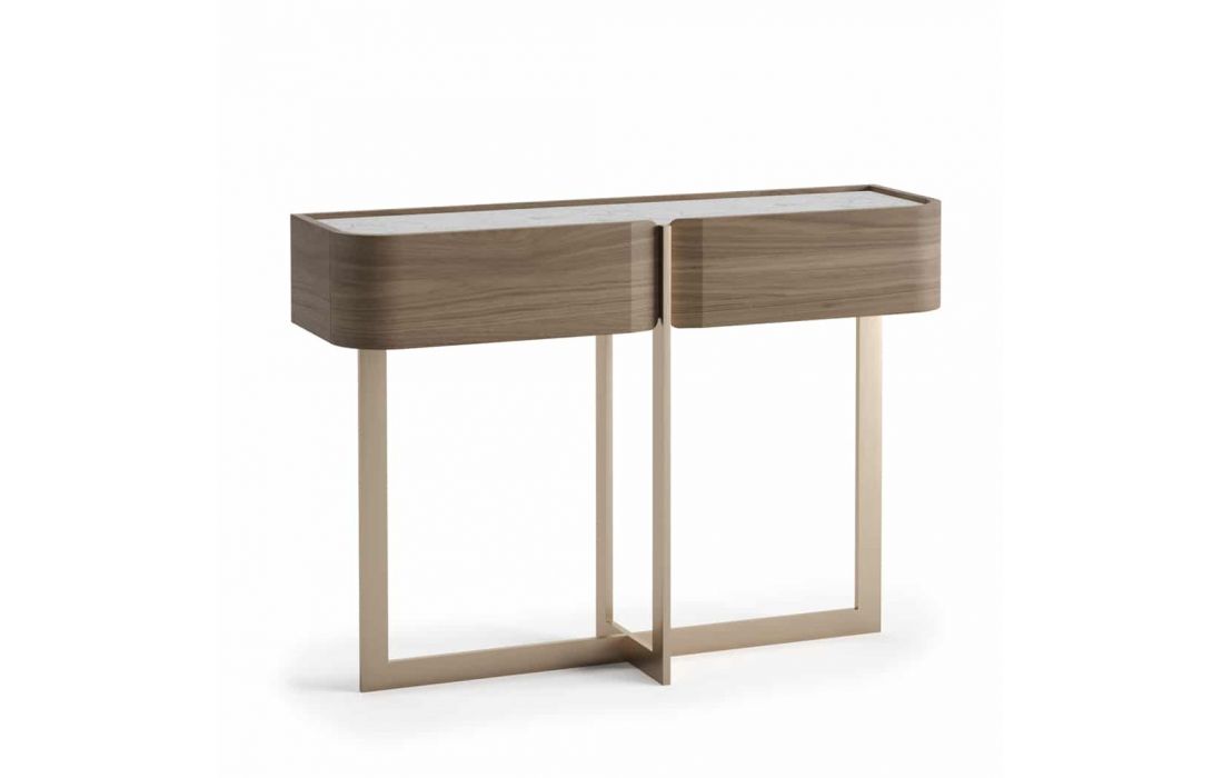 Consola de duas gavetas com estrutura em nogueira, tampo em cerâmica calacata e pé em inox dourado mate.