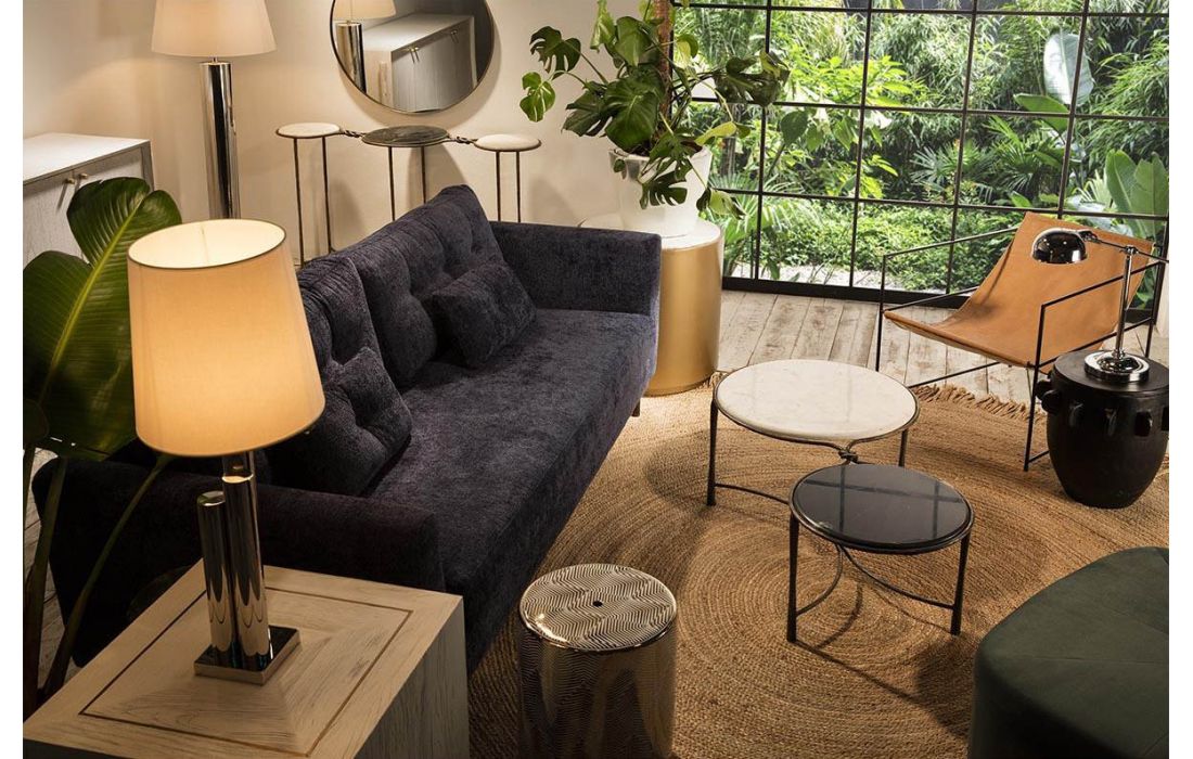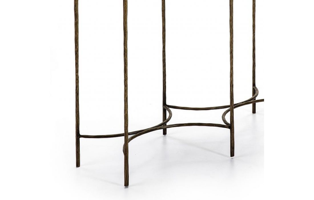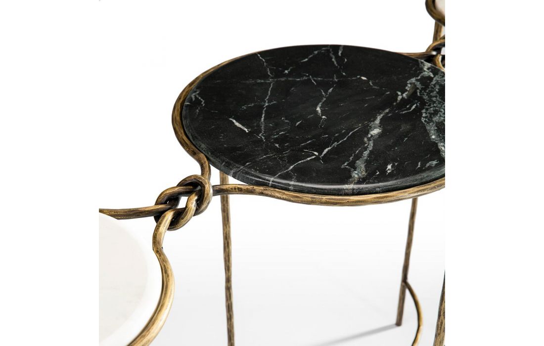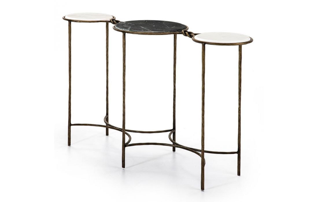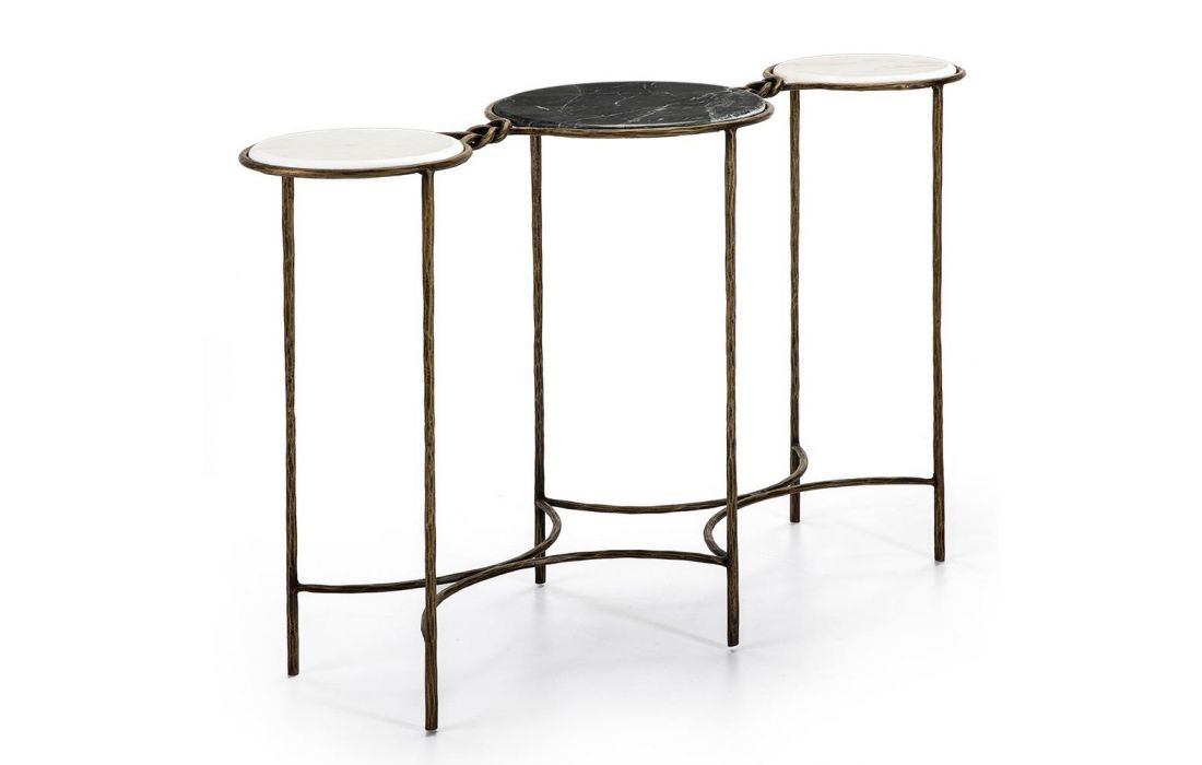Consola com estrutura em ferro e tampos de marmore cor branco e preto.