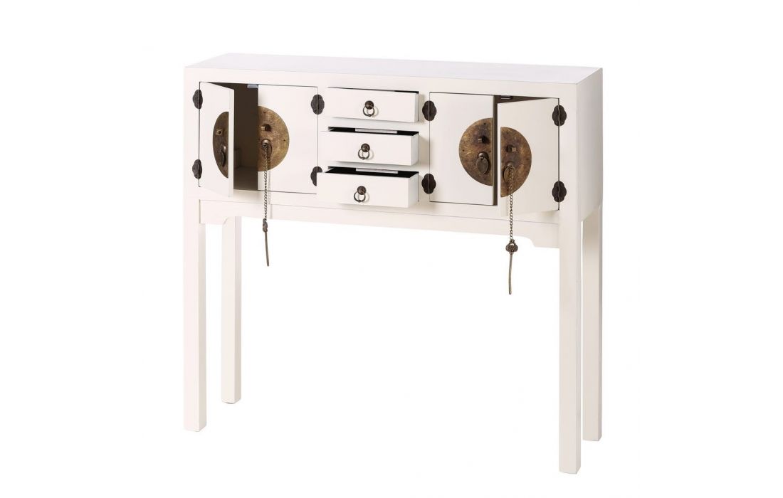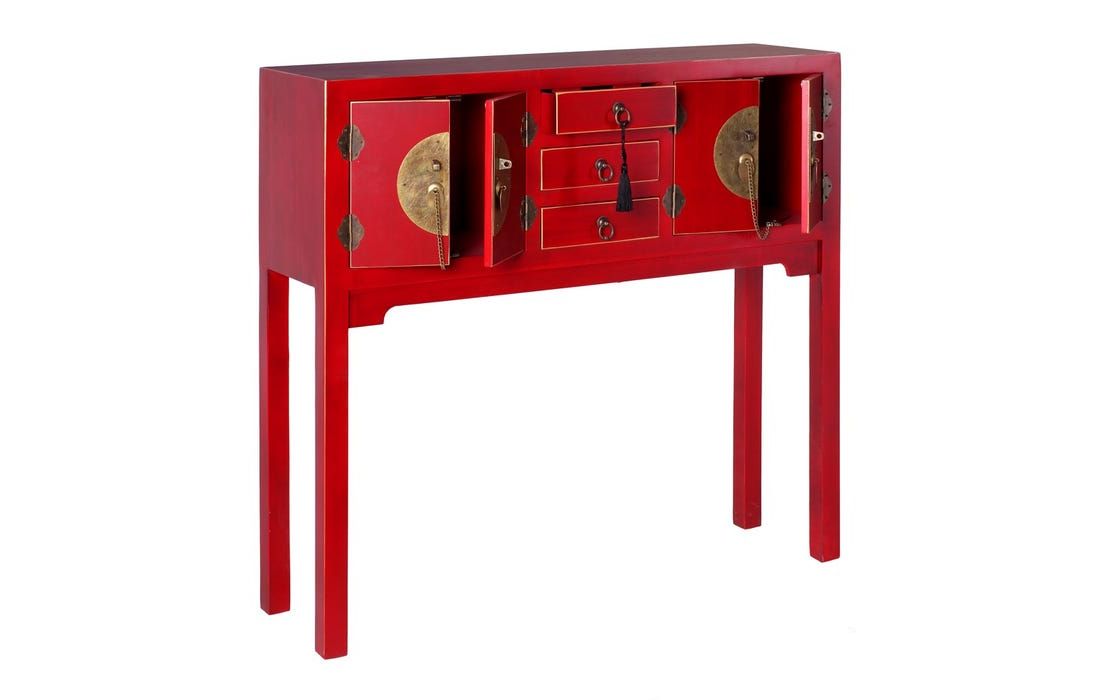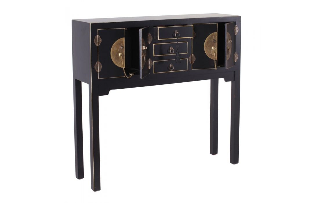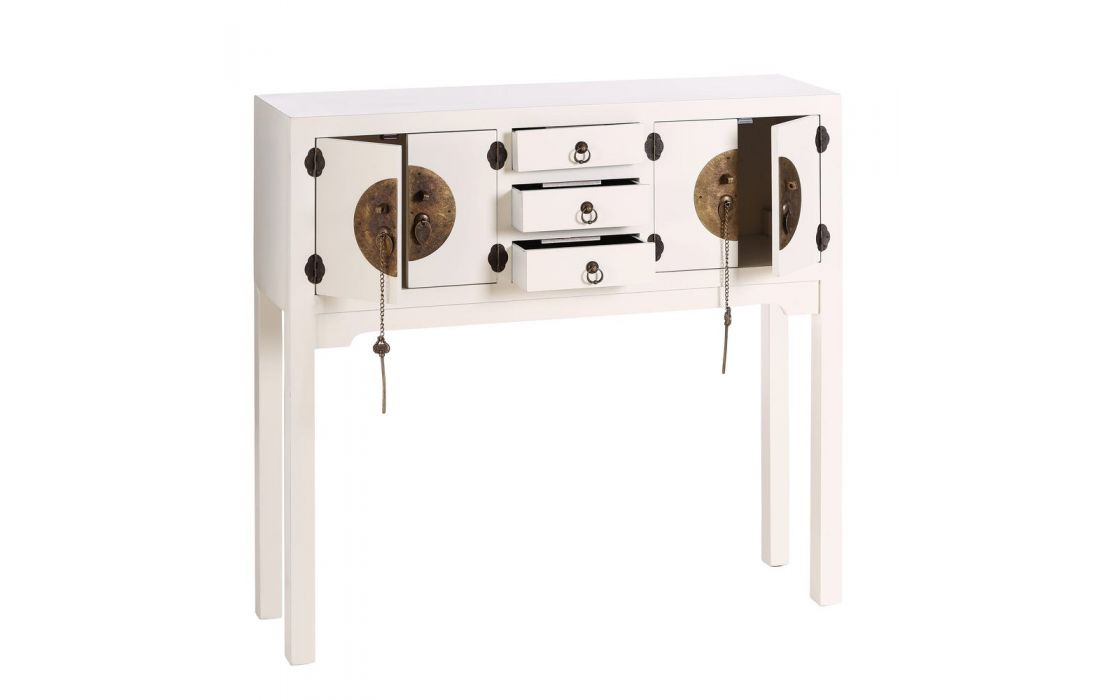 Consola em MDF c/ 4 portas e 3 gavetas e puxadores em metal dourado disponível em 4 cores, preto, branco, vermelho e azul.