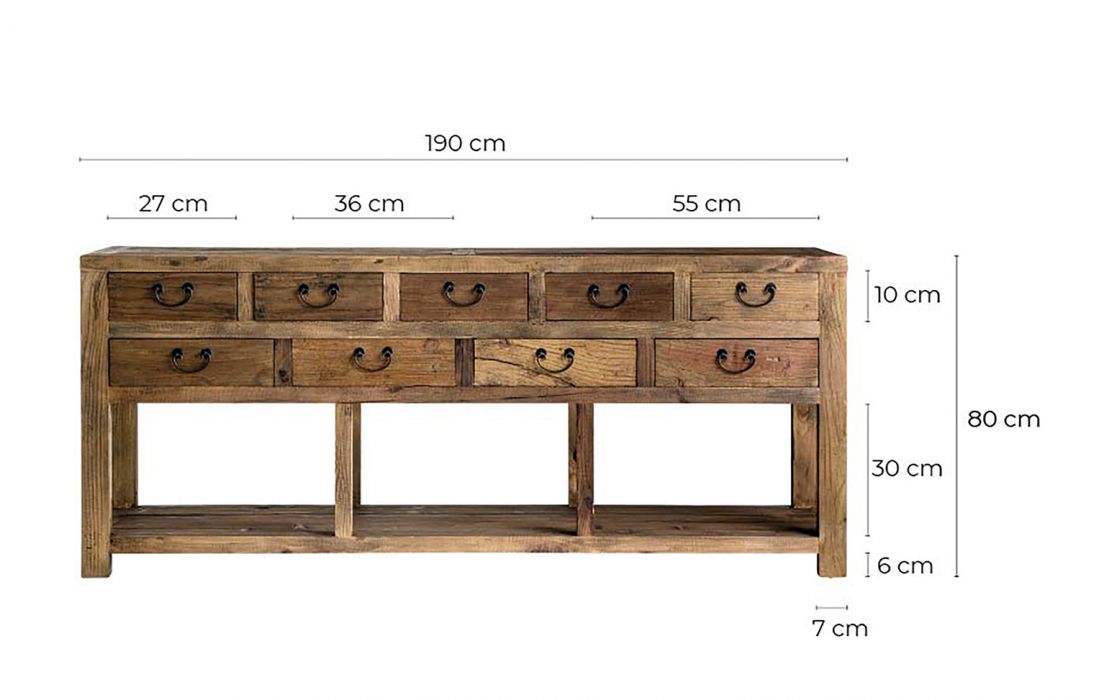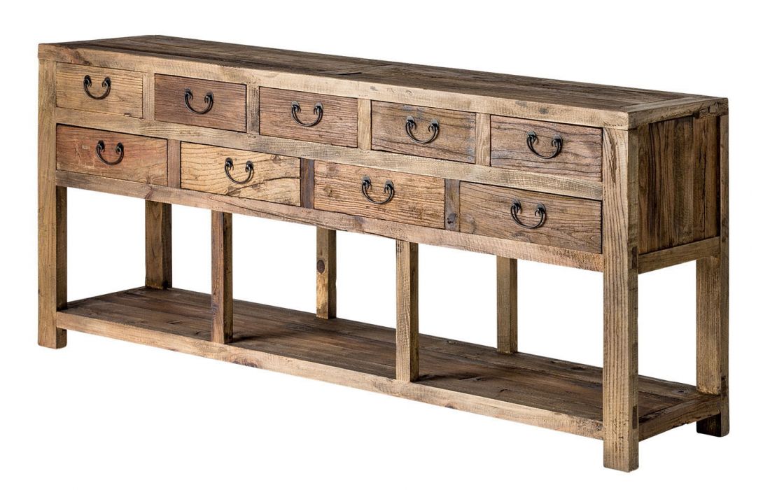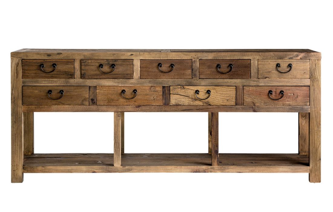 Consola de 9 gavetas estilo colonial em madeira de pinho cor natural envelhecido