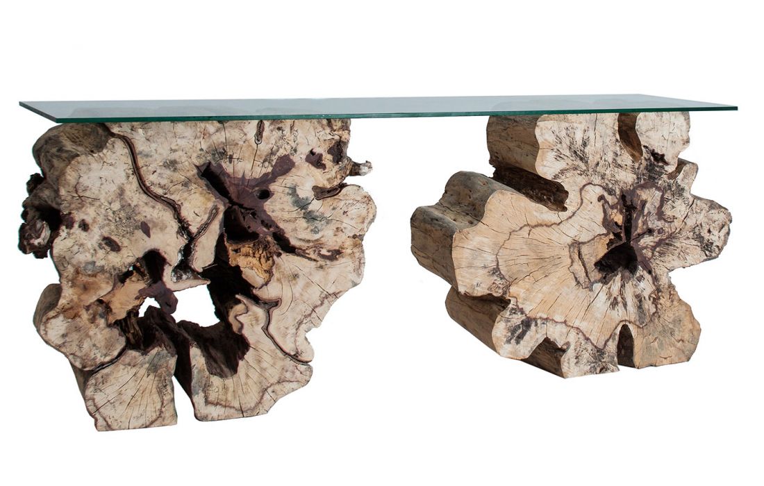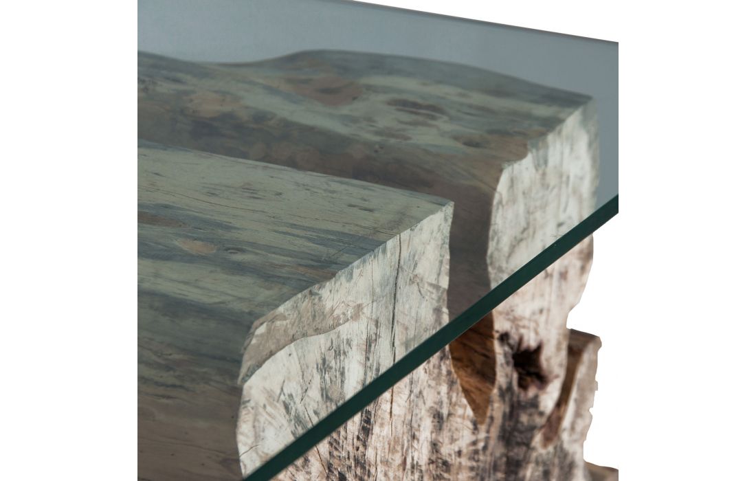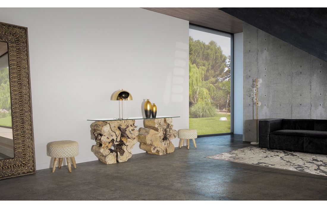 Consola de estilo contemporâneo em madeira cor natutal e tampo de vidro