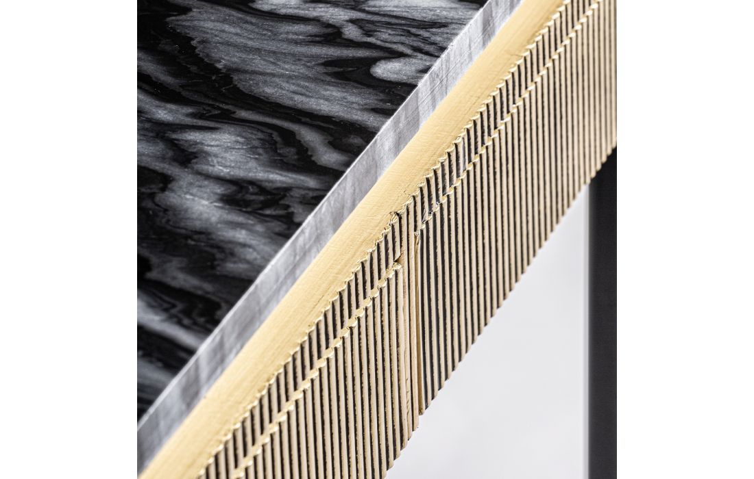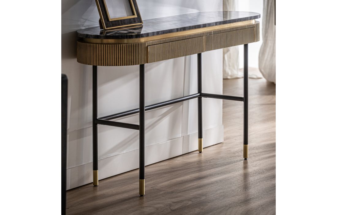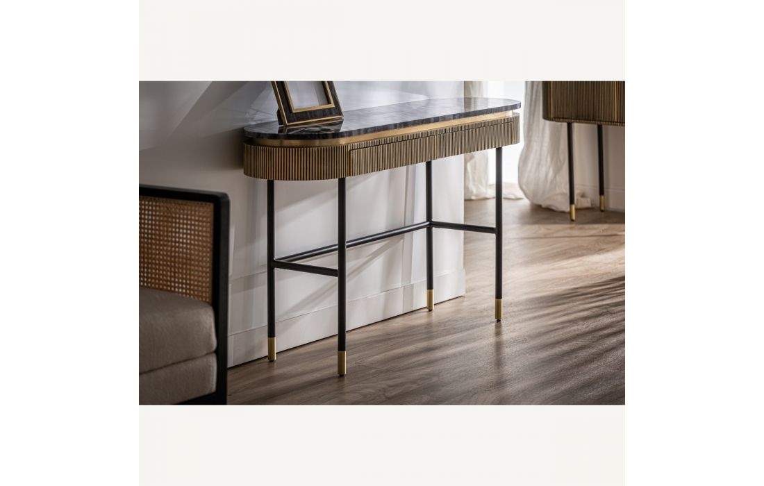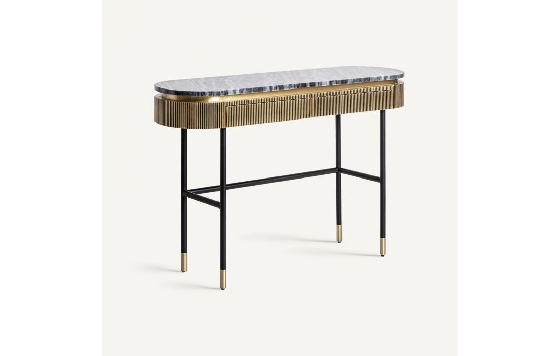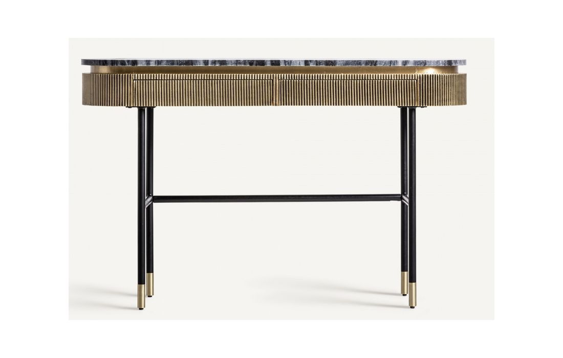 Consola em ferro em dourado com estilo envelhecido , com 2 gavetas e tampo em mármore.
