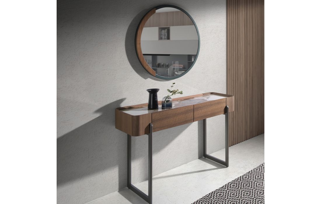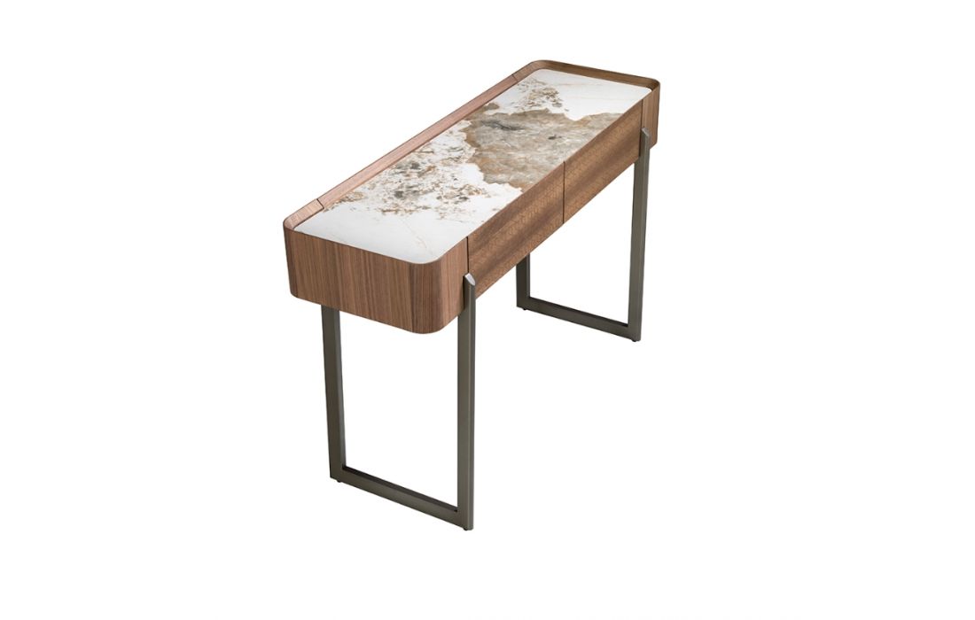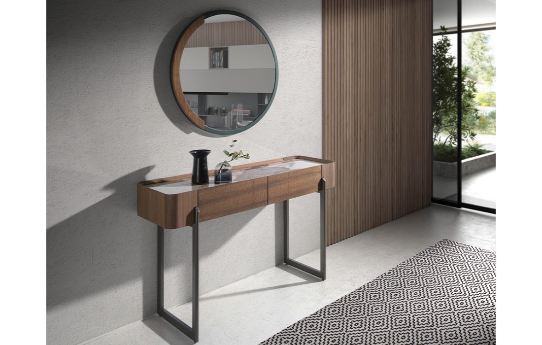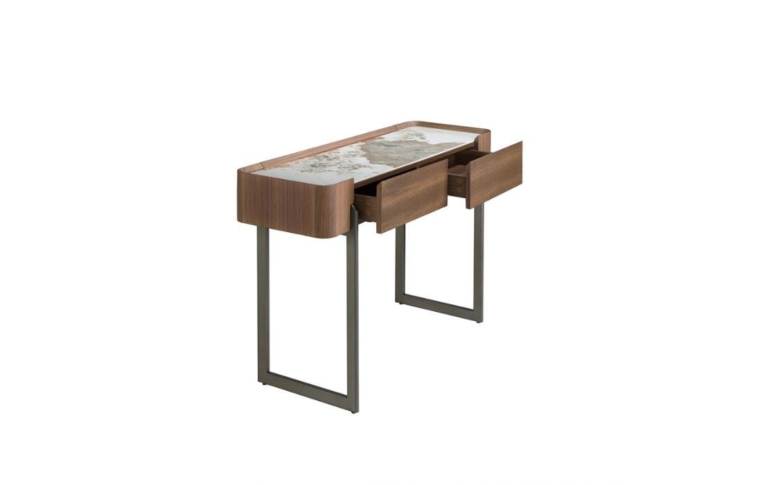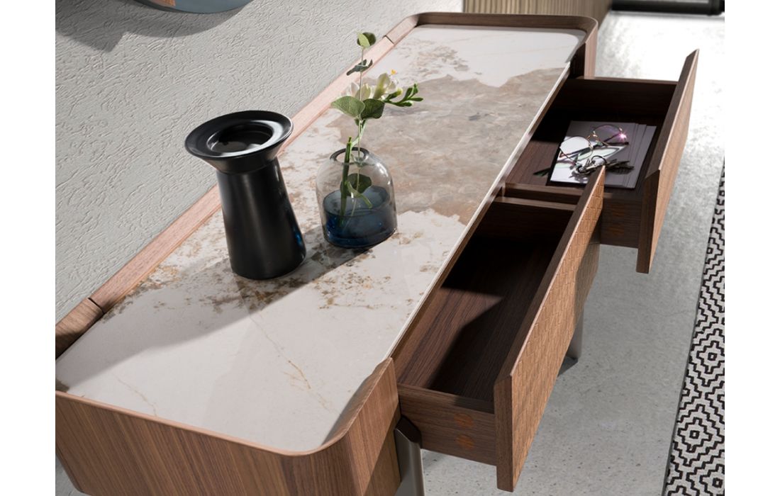 Consola retangular de design moderno em MDF a nogueira e um elegante tampo em mármore com acabamento brilhante e as suas pernas em aço inoxidável, com 2 gavetasDestinatário :