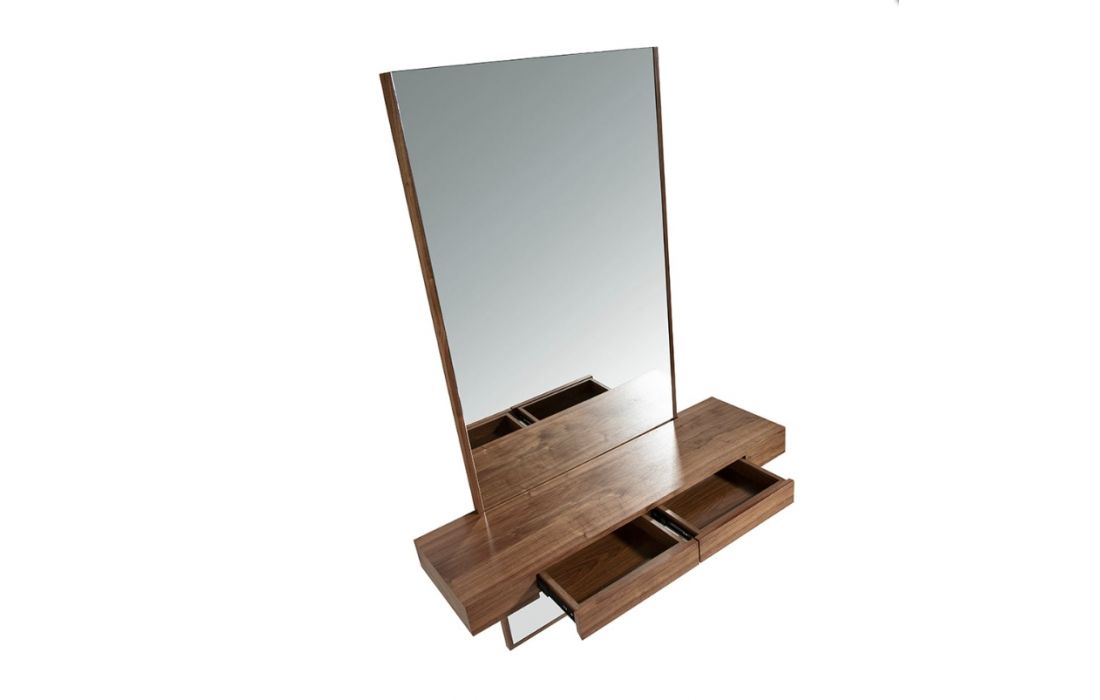 Móvel de entrada com espelho de parede e consola em madeira folheada a nogueira com duas gavetas.