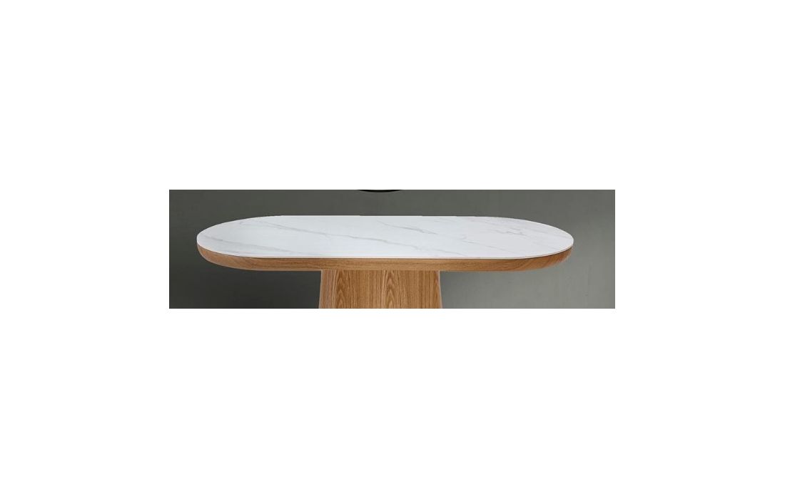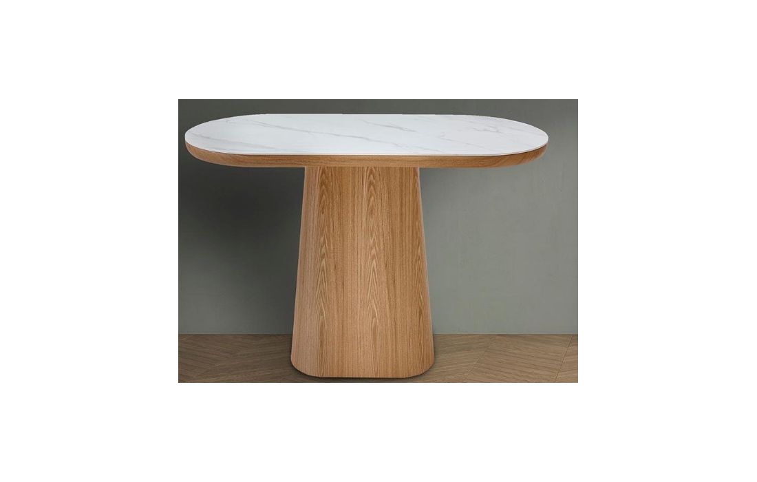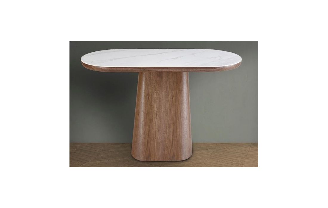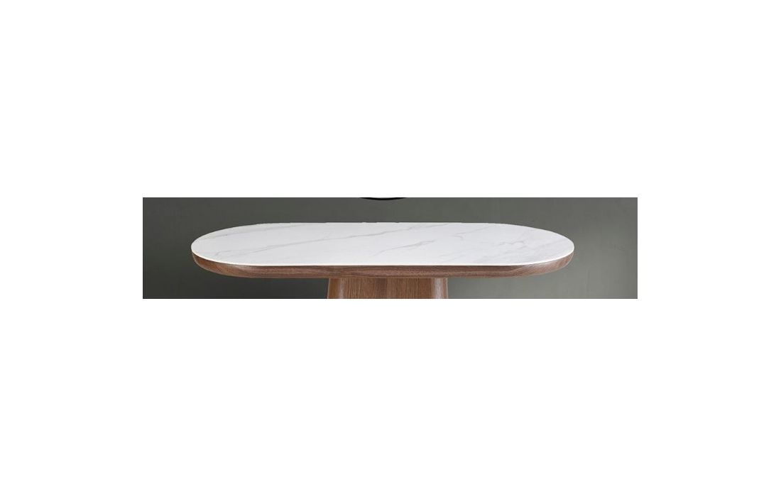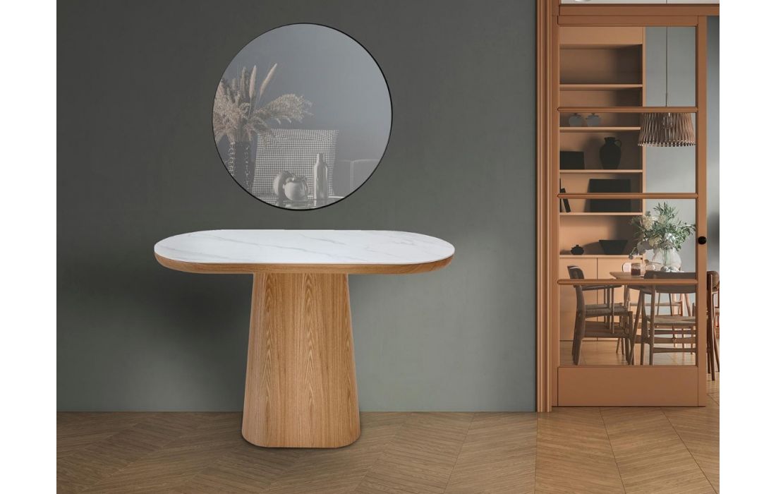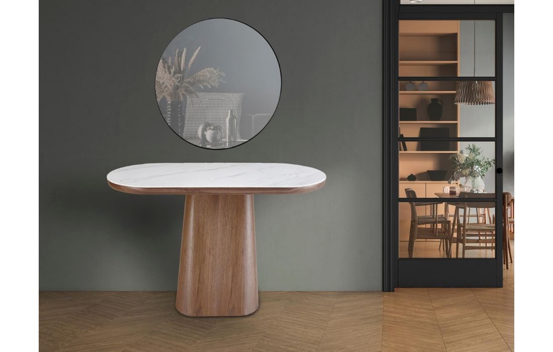 Consola para hall com estrutura em folha de carvalho e negueira com tampo em porcelana.