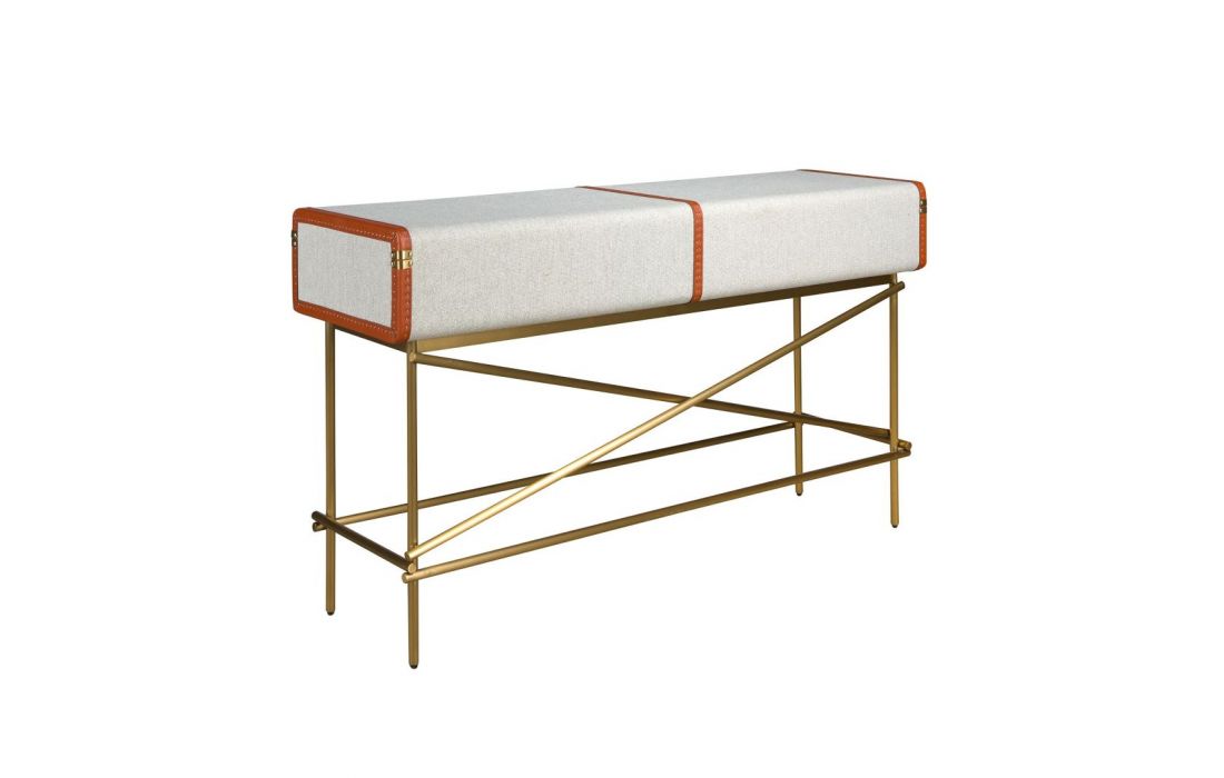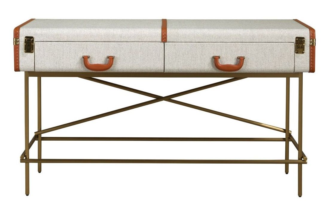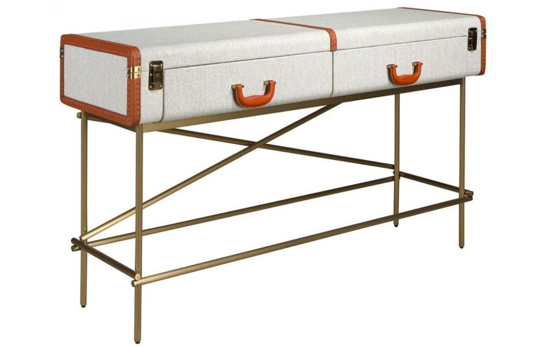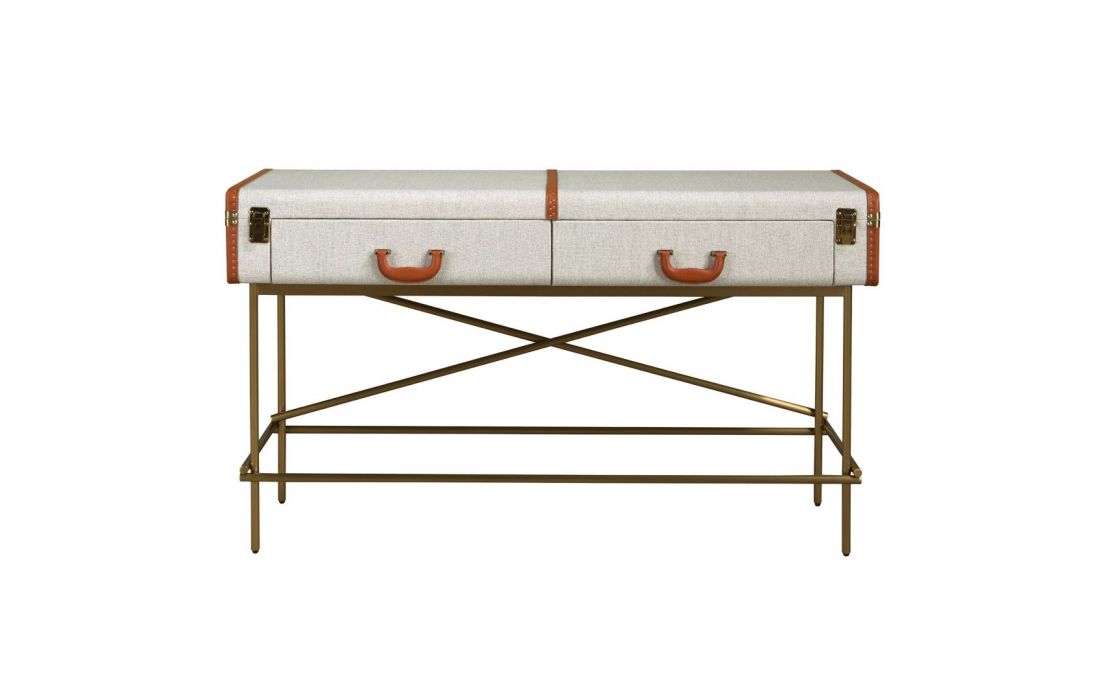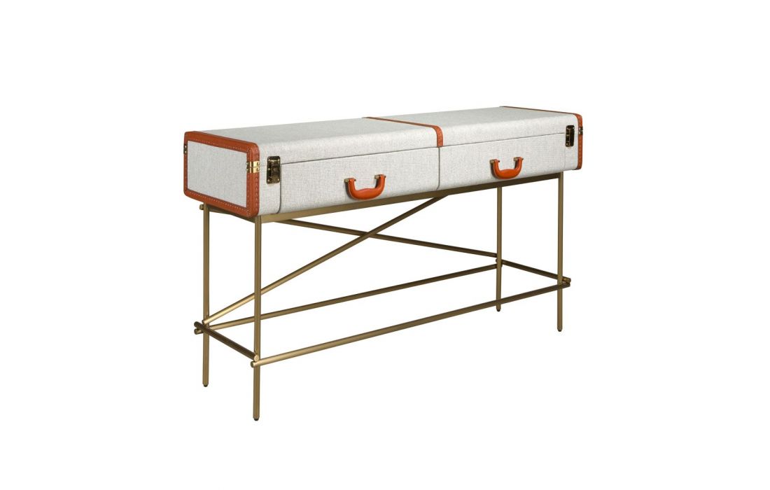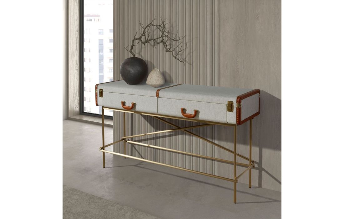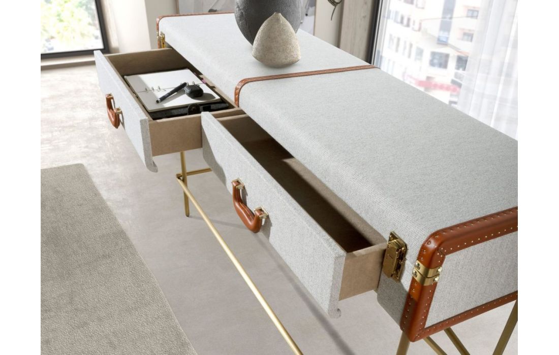 Consola moderna feita de MDF de nogueira natural combinada com um elegante estofamento de tecido cinza claro e as suas pernas em aço inoxidável, com detalhes em pele de bovino e 2 gavetasDestinatário :