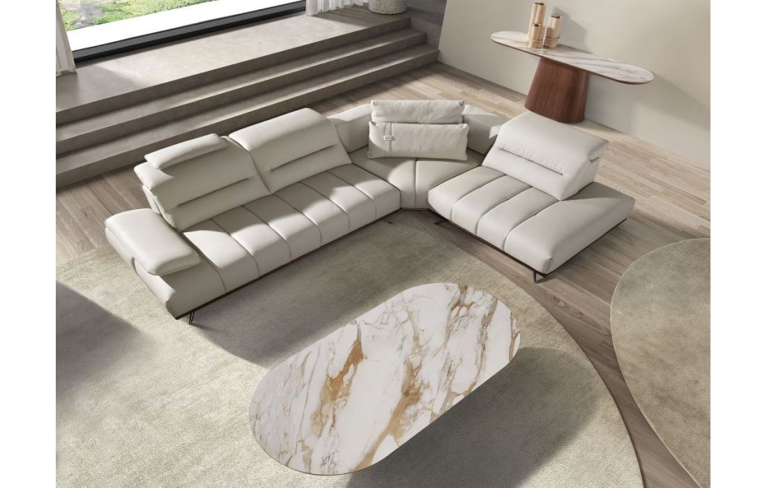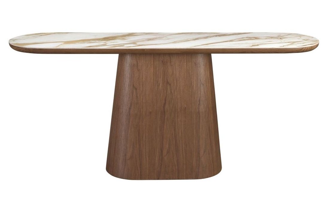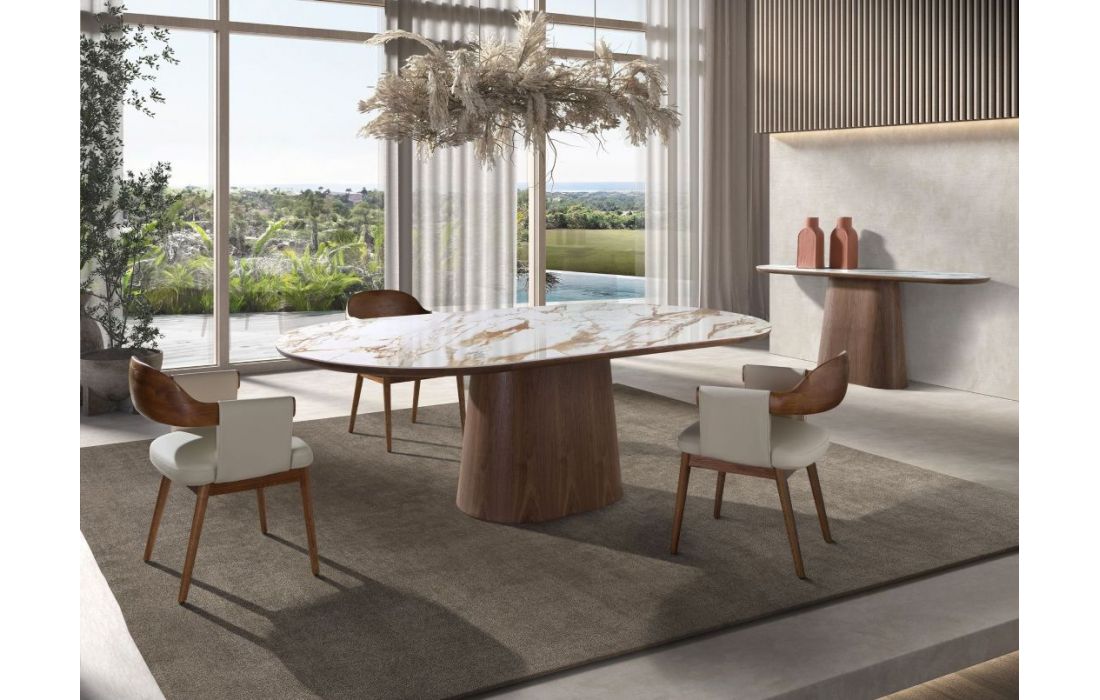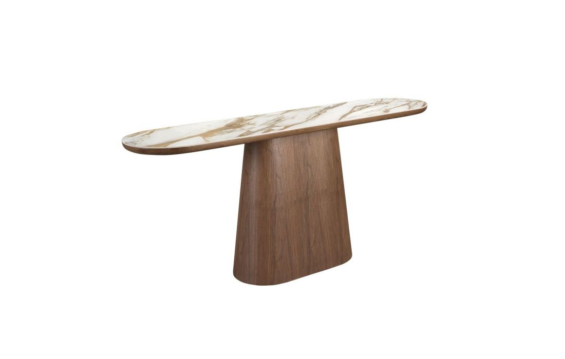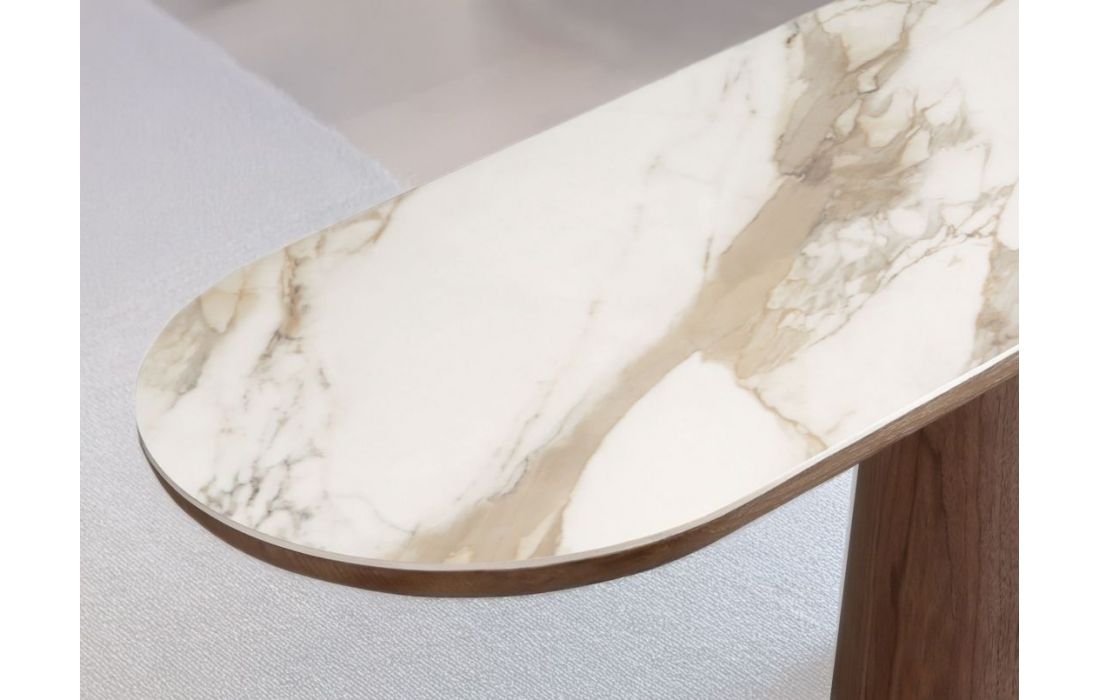 Consola oval moderna com acabamento brilhante, tampo em mármore e pés originais em folheado de nogueiraDestinatário :