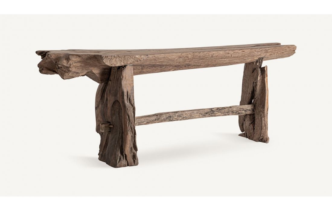 Consola em madeira de teca com design rústico e orgânico, destacando as formas naturais e textura autêntica da madeira. Estrutura robusta e única, ideal para ambientes acolhedores, acrescentando carácter e autenticidade ao espaço.