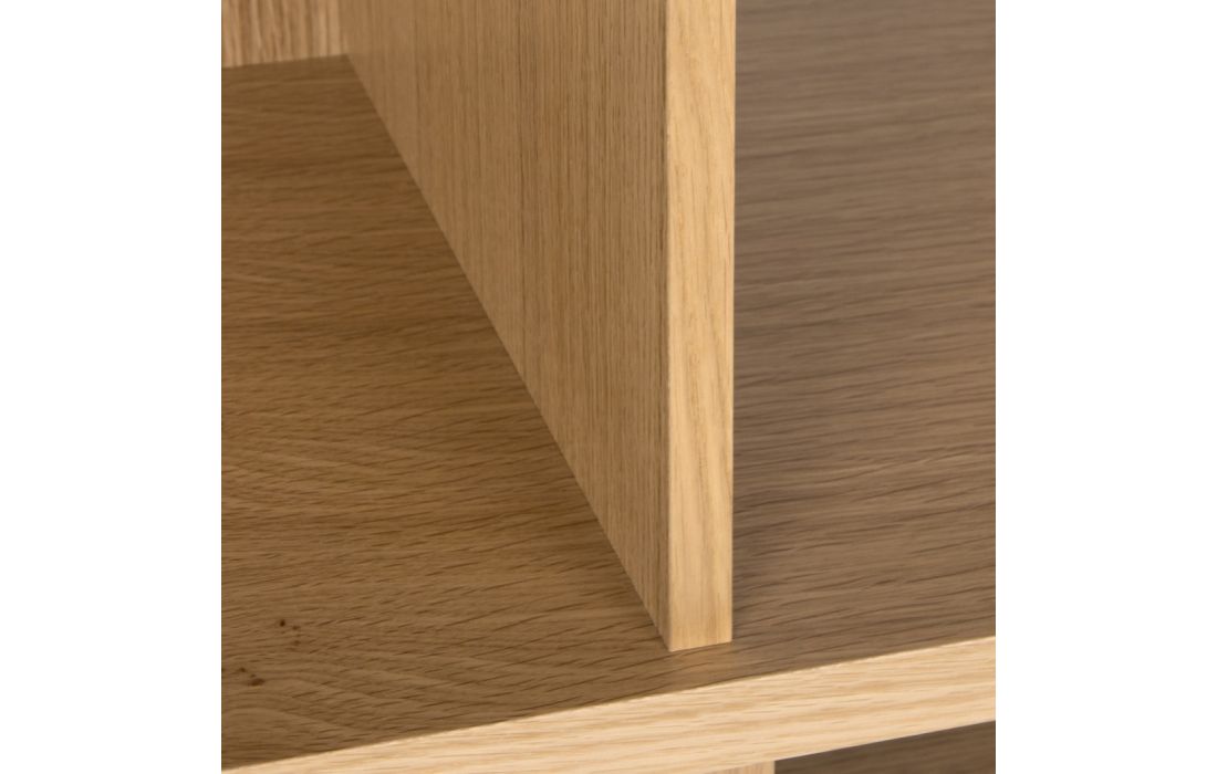 Consola com múltiplas opções ao nível dos tons de acabamento, permite escolher prateleiras do mesmo tom da estrutura ou contrastar os acabamentos das costas e prateleiras com o da estrutura, é versátil para todo o tipo de decoração, e permite ser adaptada ao ambiente criado.