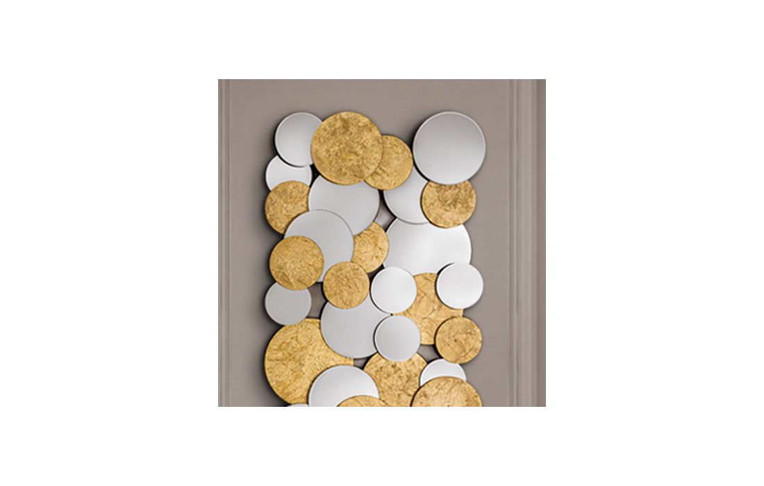 Espelho formado por esferas de luas biseladas e vidro com fundo em folha de ouro e costa em MDF de cor preto.