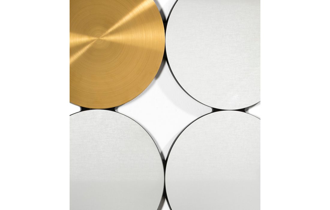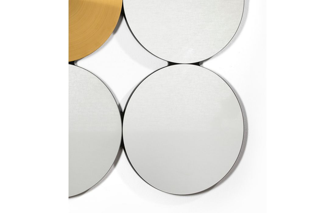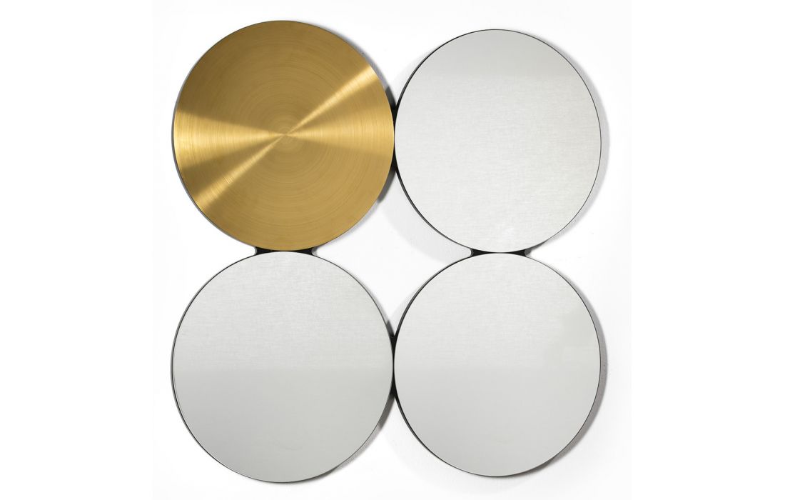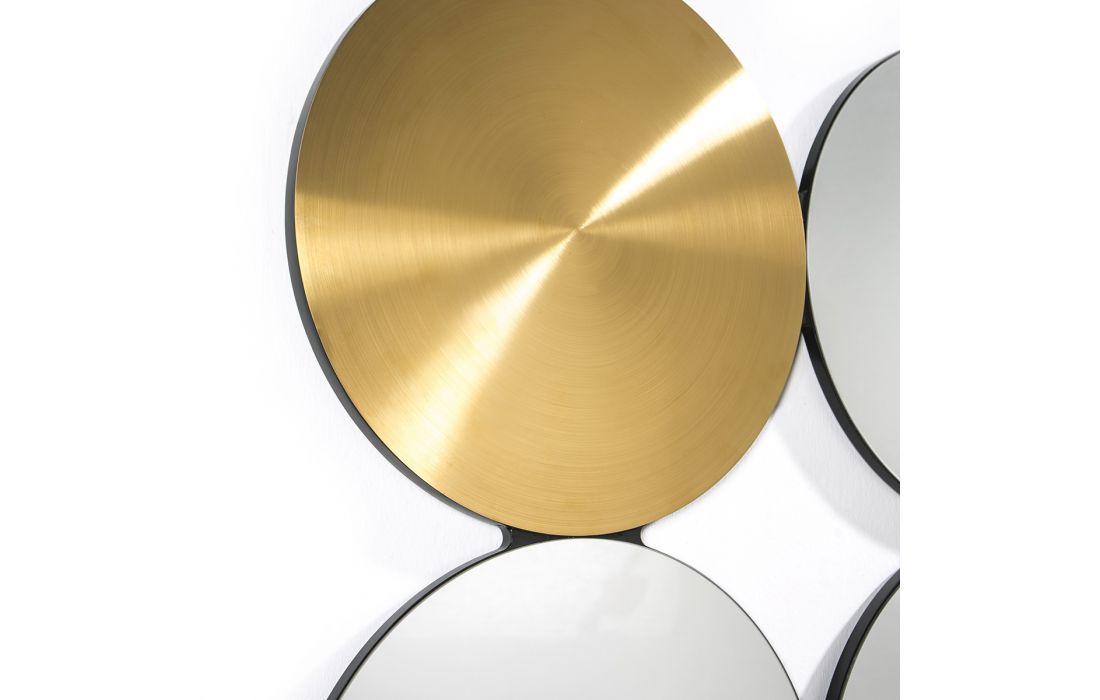 Espelho com moldura em metal preto e circunferências em metal dourado e vidro.