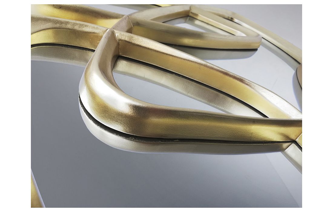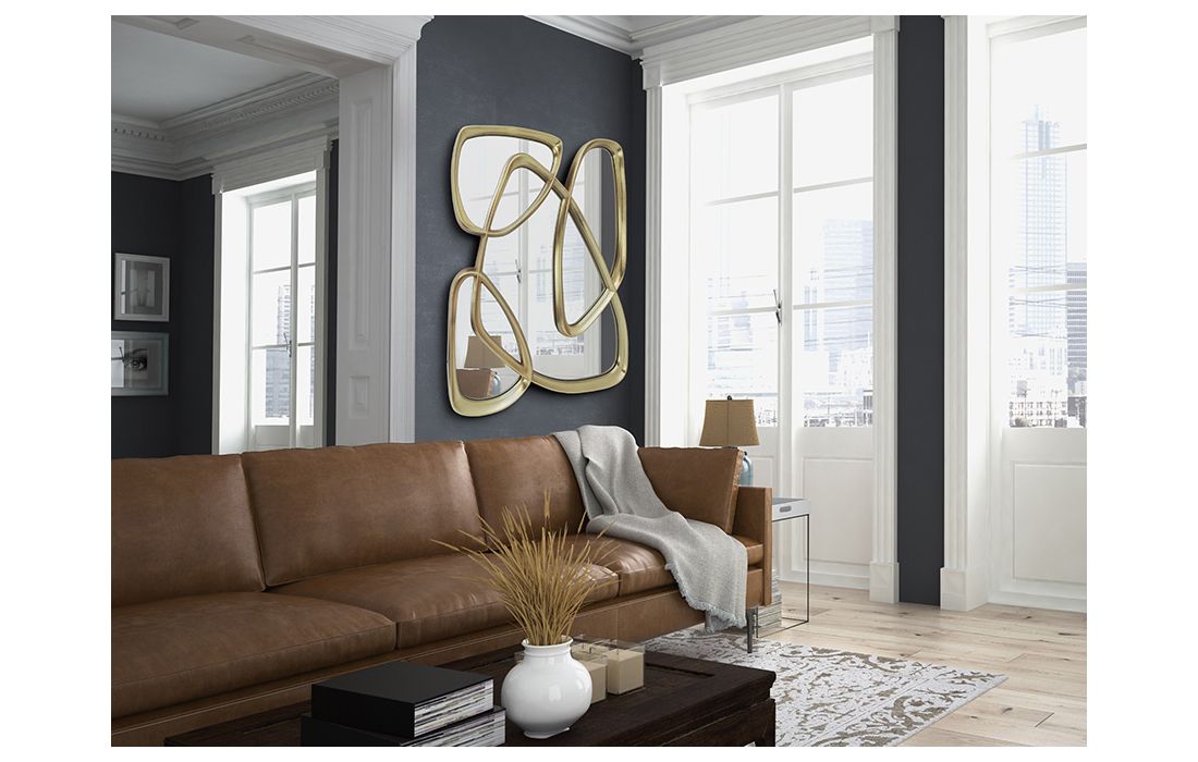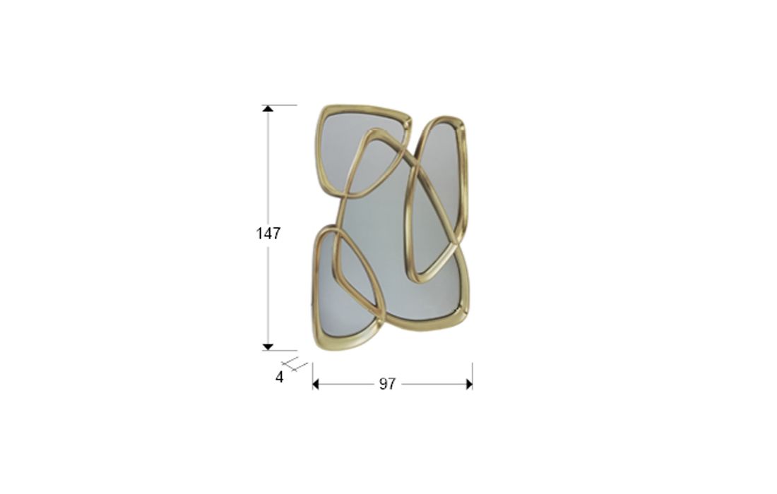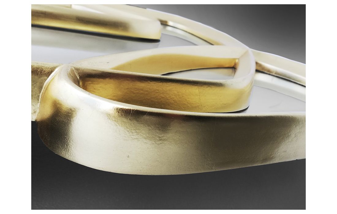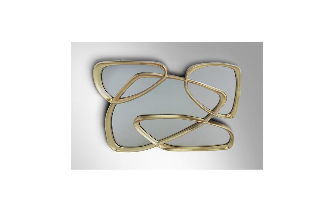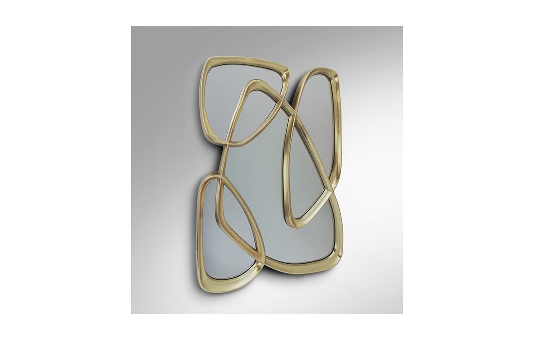 Espelho com moldura em poliuretano moldado com acabamento em folha de ouro. Preparado para pendurar em posição horizontal ou vertical.