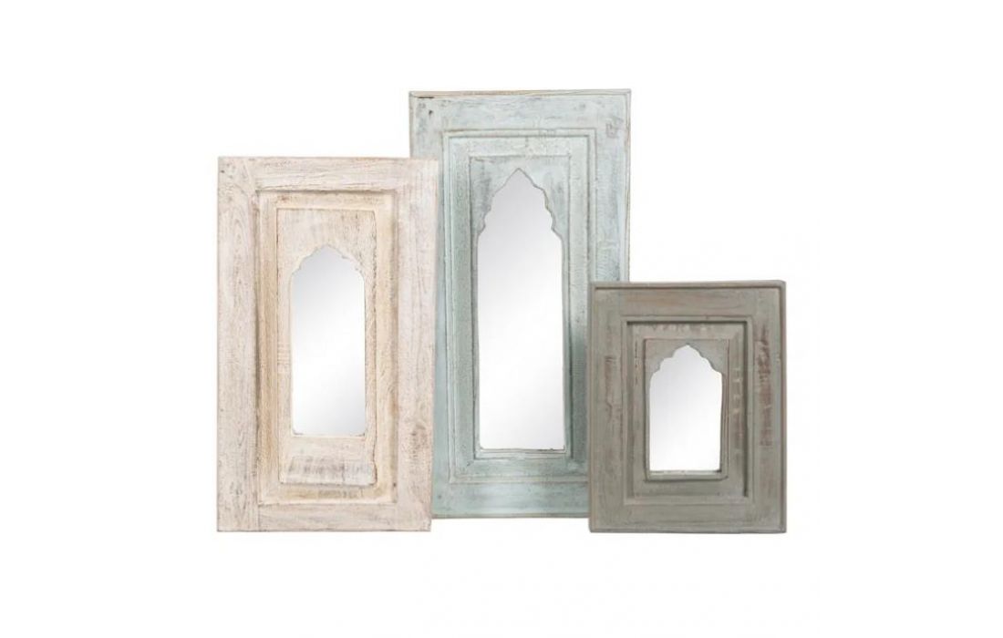 Especificações do Produto Madeira, espelho Cada conjunto inclui três modelos e cores sortidas. Medidas dos espelhos nas fotos: 27x41cm - 32x40cm - 35x52cm - 36x61cm - 37x57cm - 37x72cm. Estas medidas são indicativas, cada espelho é uma peça única. Não fazemos qualquer alteração ao produto Manutenção e Limpeza Limpar com um pano seco Para tirar manchas deve usar um pano húmido e de seguida passar um pano seco