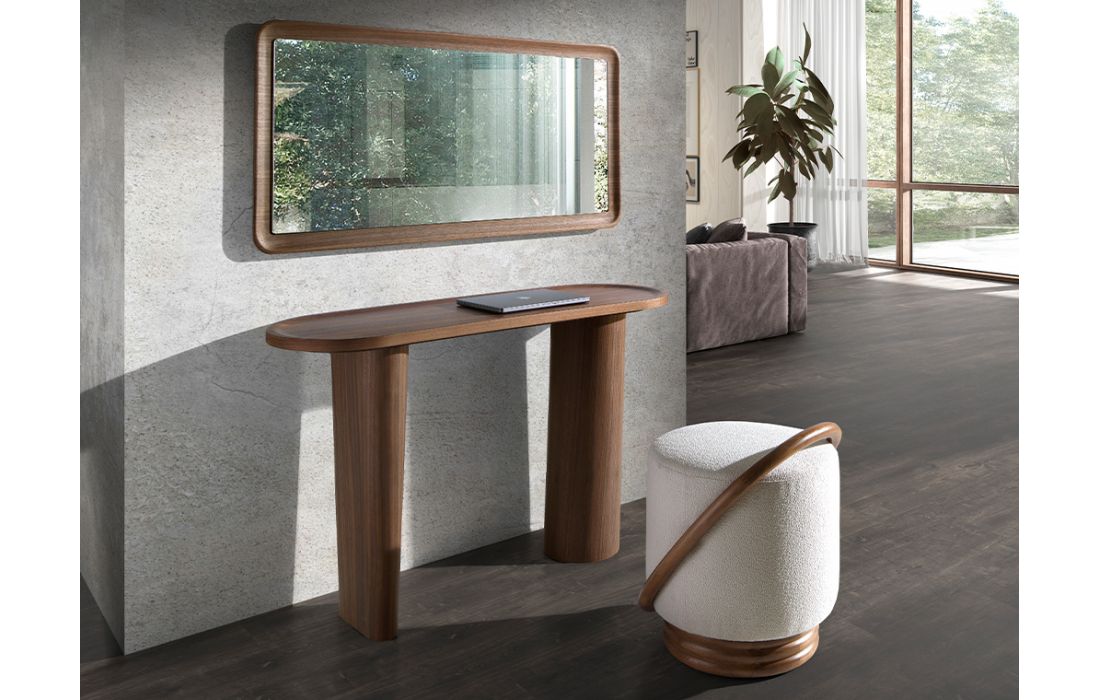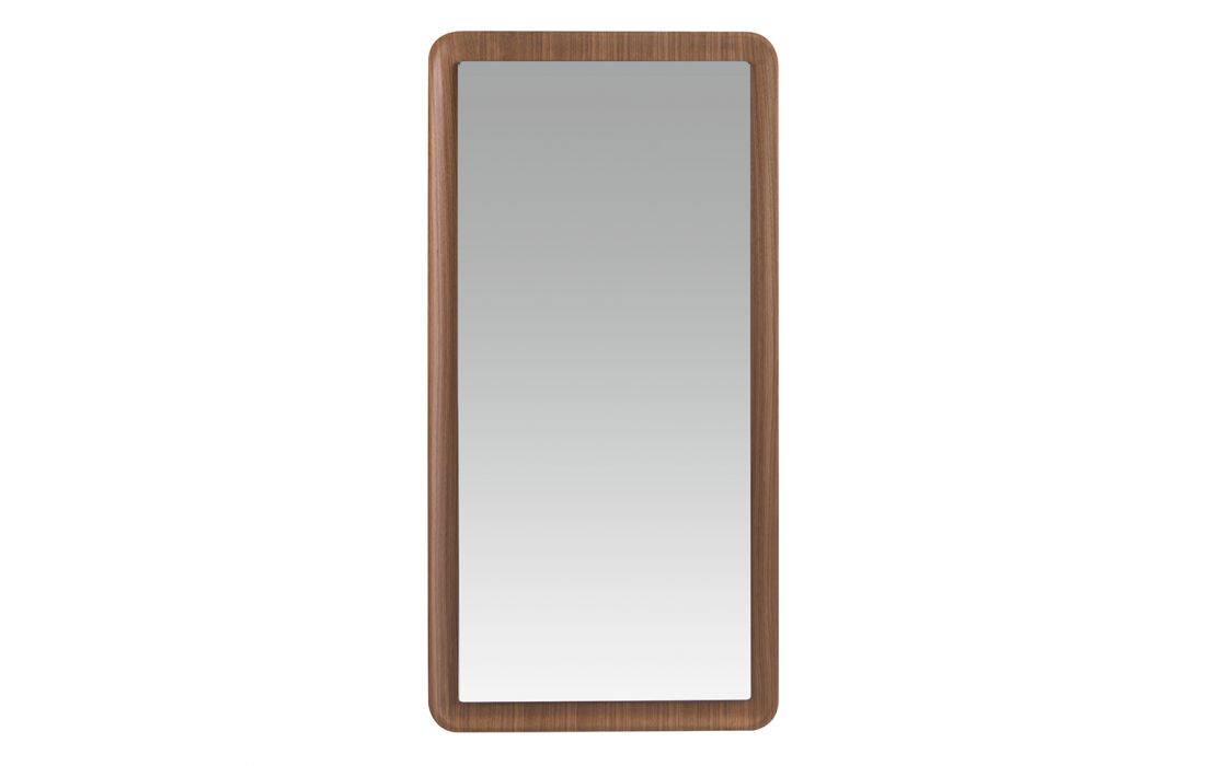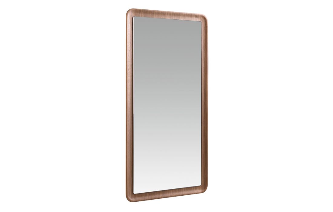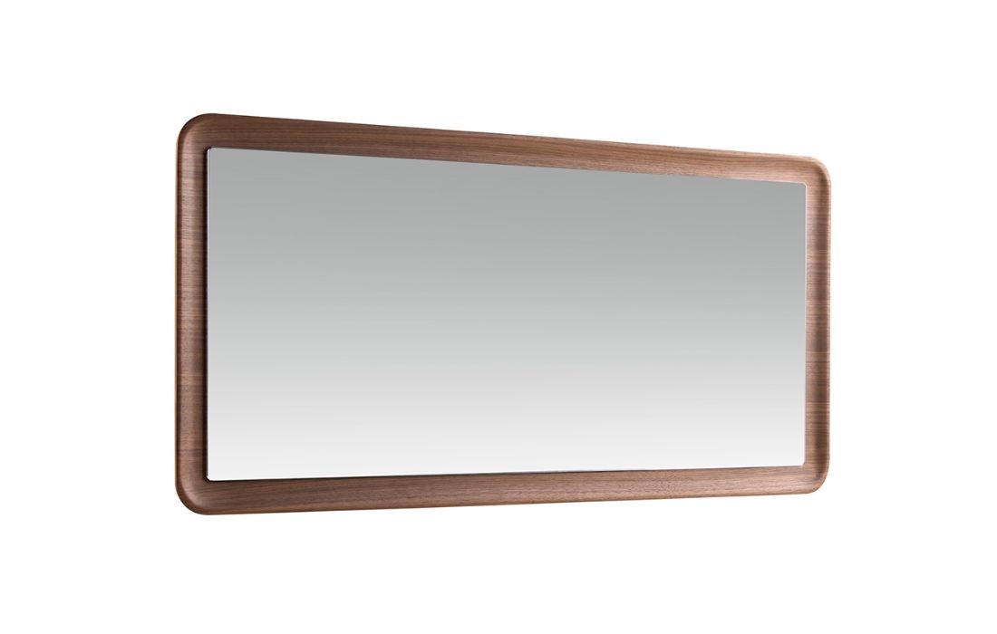 Espelho de parede retangular com moldura em madeira folheada a nogueira natural.