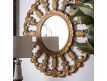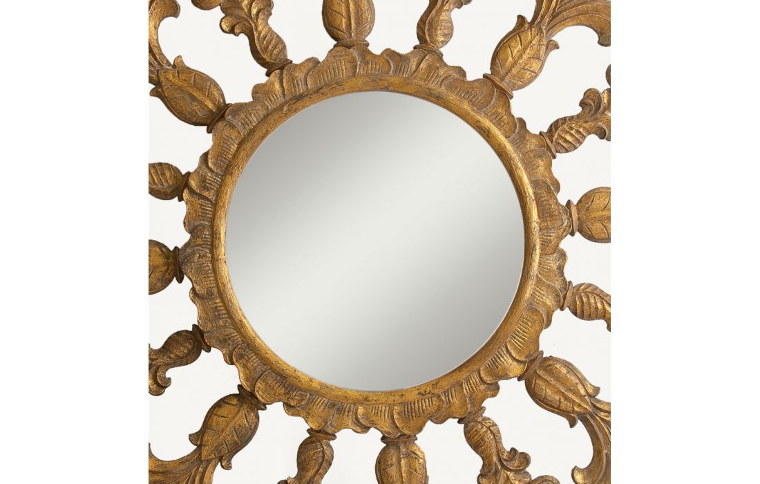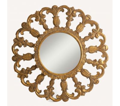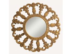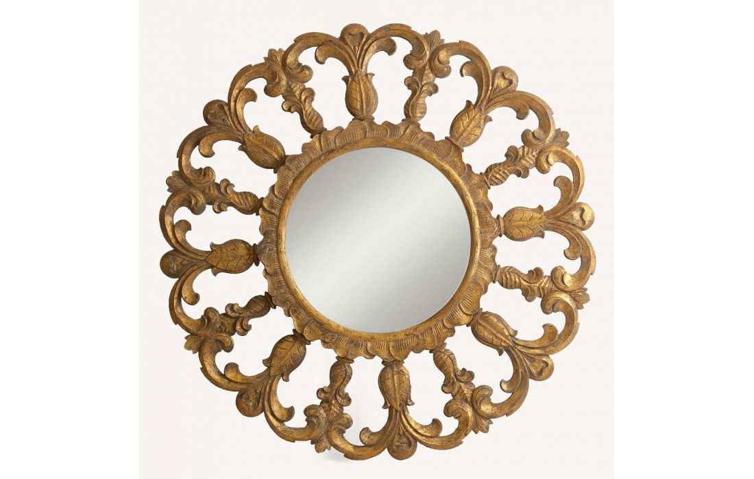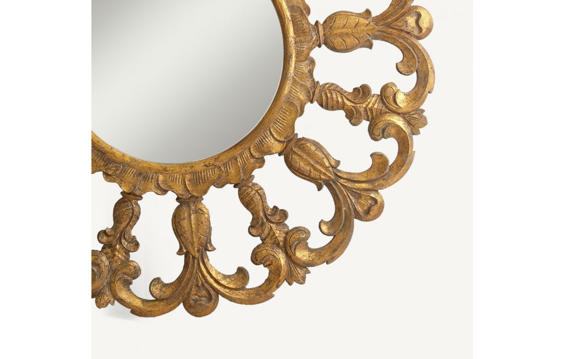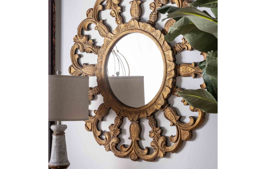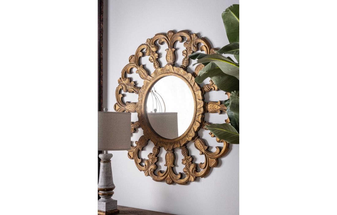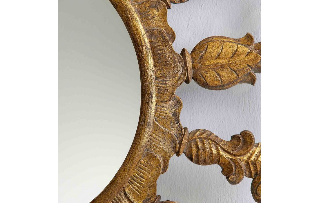Espelho redondo com moldura em madeira tropical cor dourado envelhecido