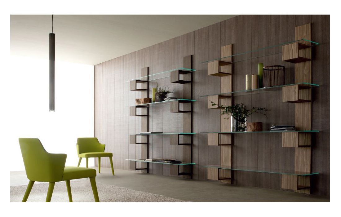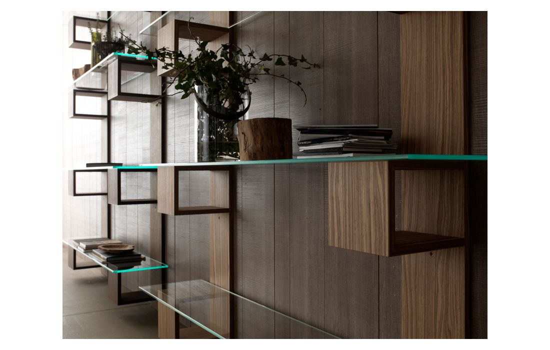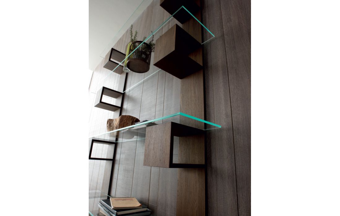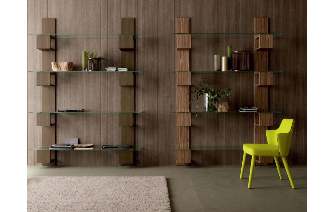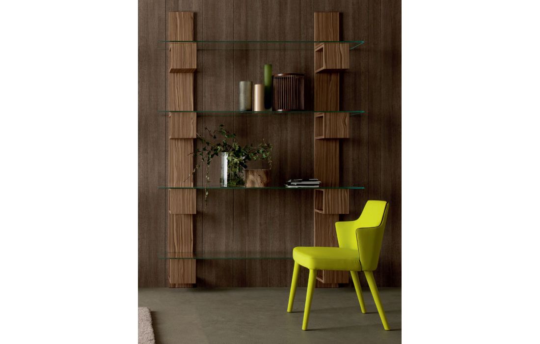 Livreiro moderno com estrutura em madeira de nogueira ou carvalho queimado com prateleiras em vidro transparente extra claro