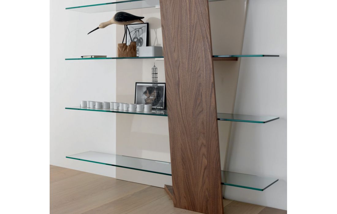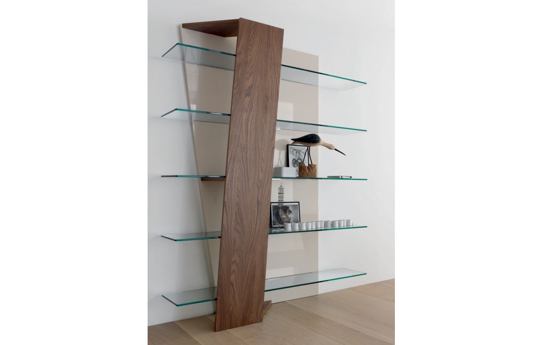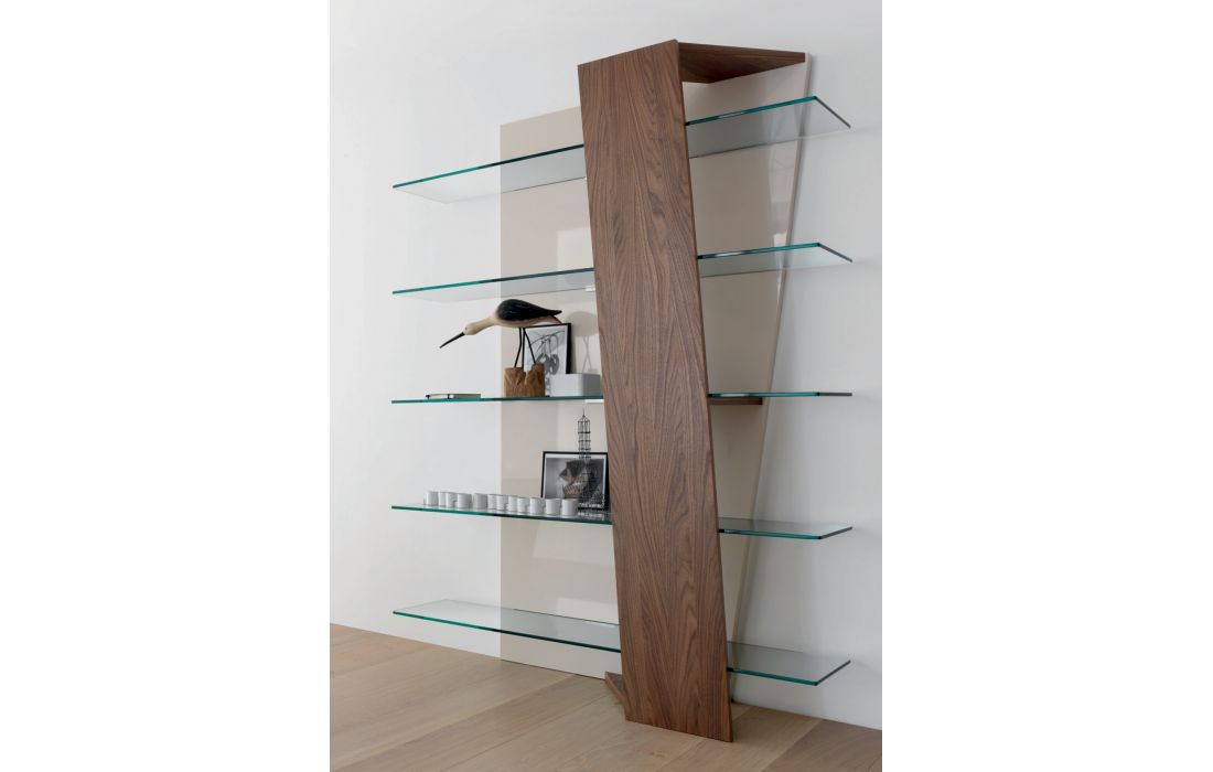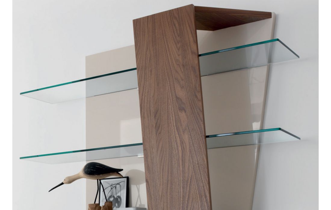 Livreiro moderno de parede em MDF lacado bege com promenor da frente em madeira com prateleiras em vidro transparente extra claro