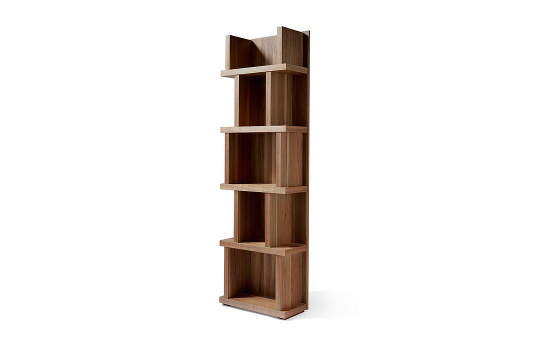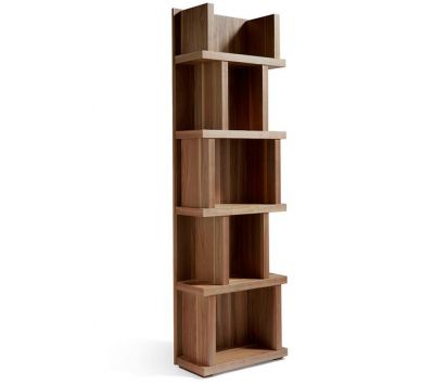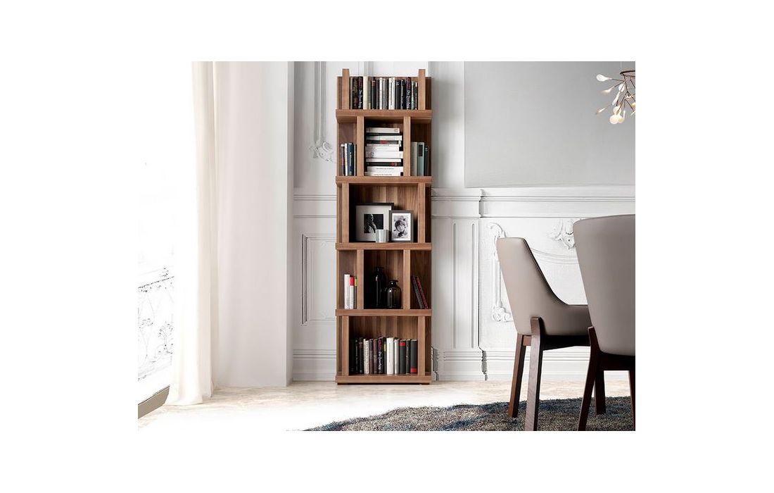 Livreiro com 5 prateleiras, estrutura em folha de madeira de nogueira.