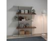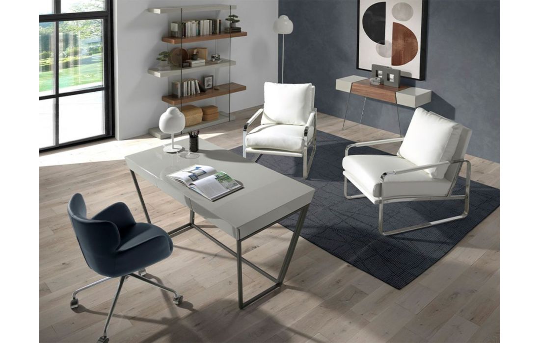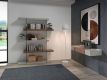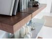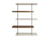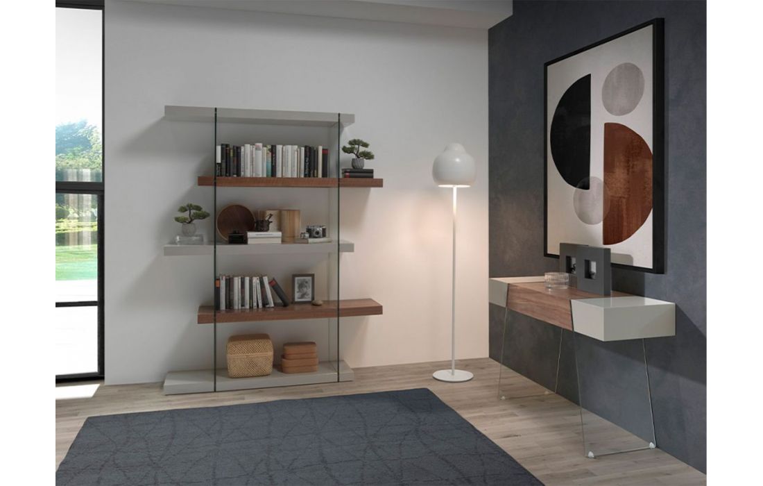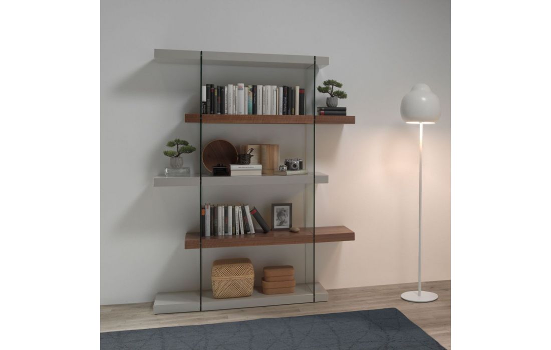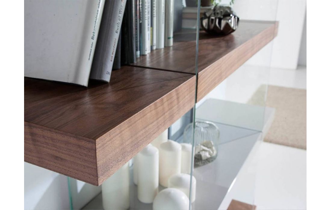 Estante simples e moderna em MDF de nogueira com cubos em MDF lacado com acabamento brilhante e detalhe em vidroDestinatário :