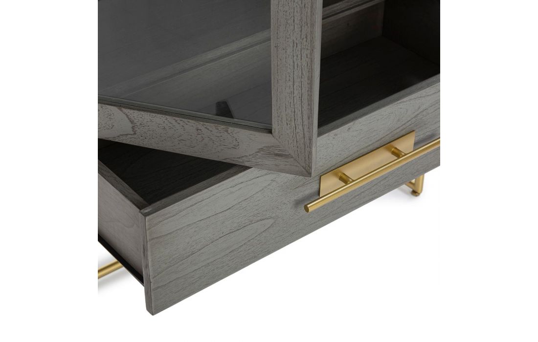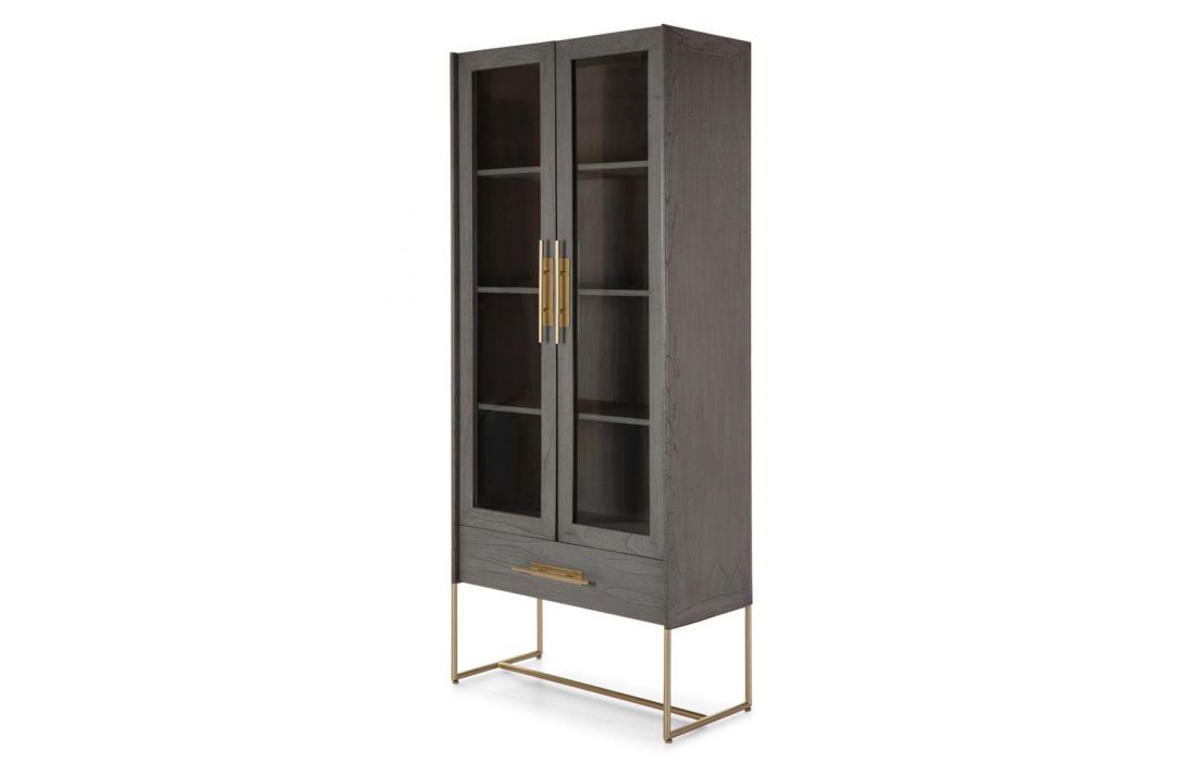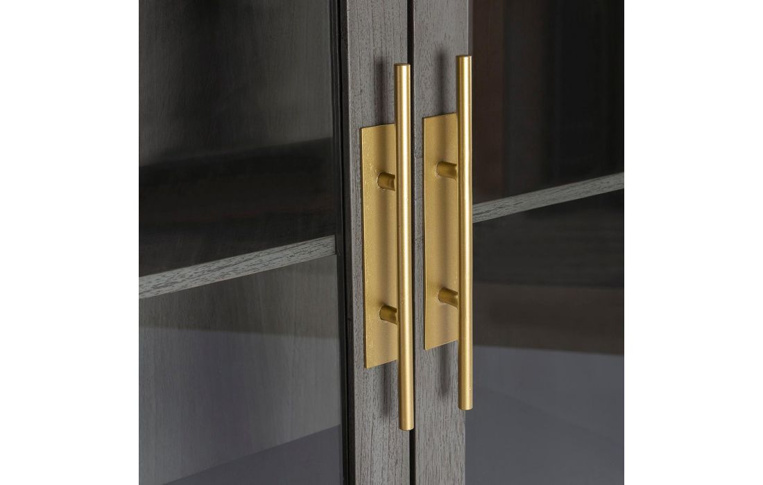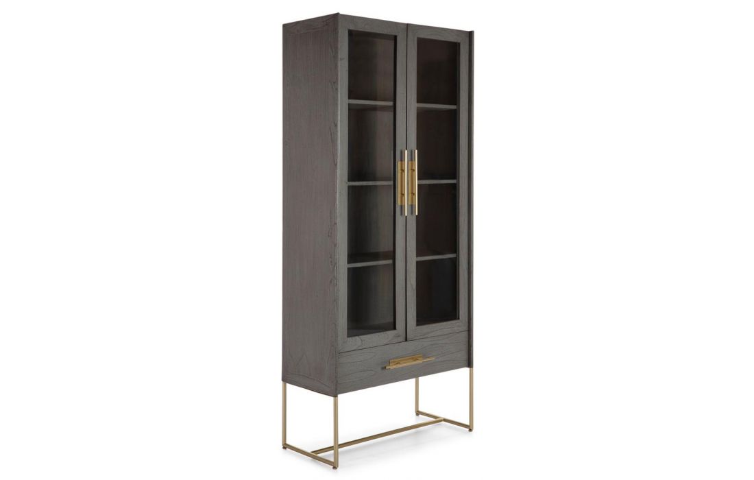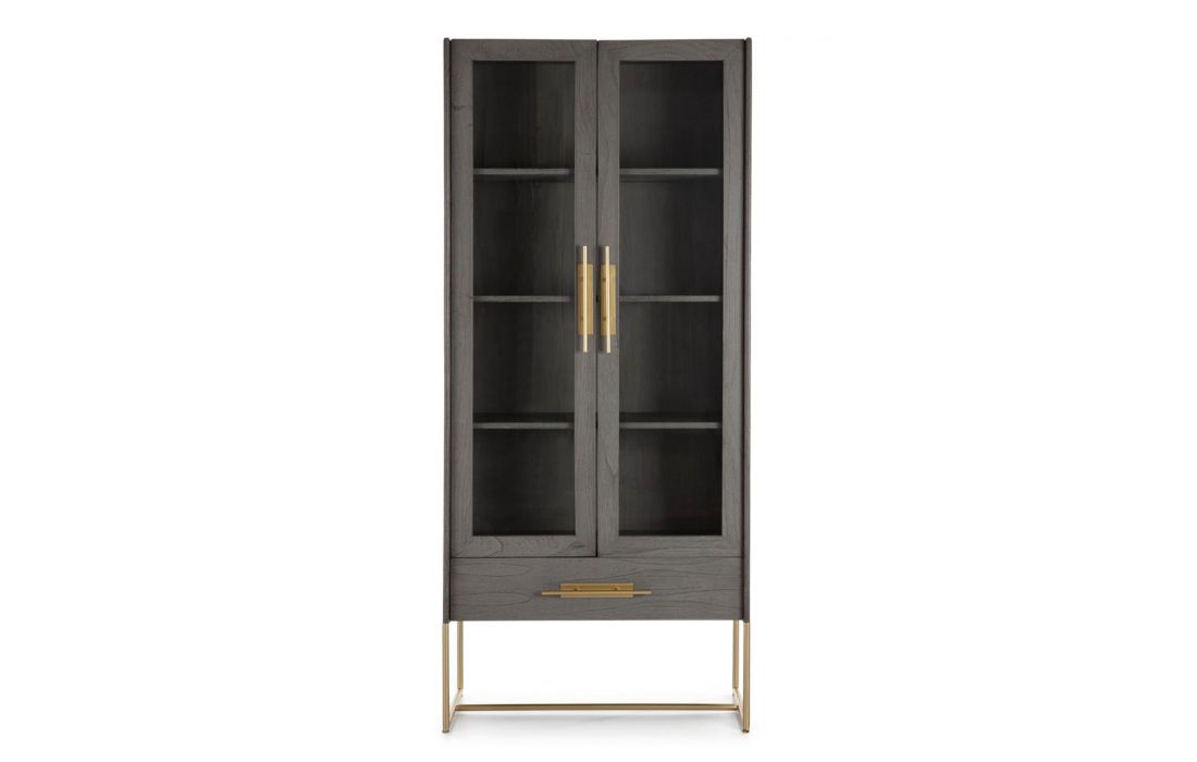 Livreiro de 2 portas de vidro e 1 gaveta com pés e puchadores em metal dourado e estrutura em madeira de cedro cor cinza.