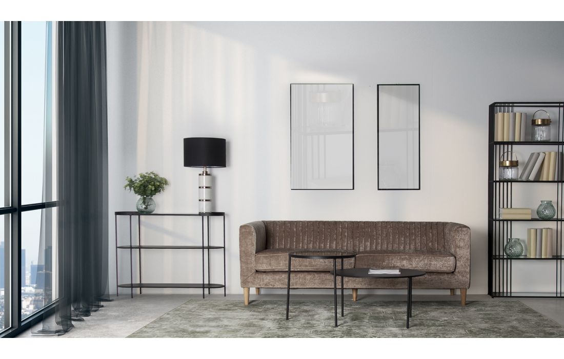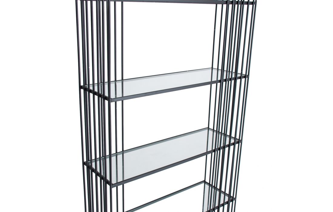 Livreiro feito com finas hastes de ferro e com prateleiras em vidro.