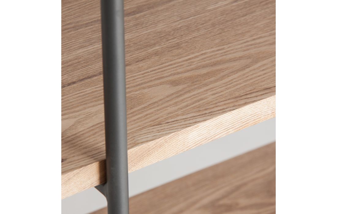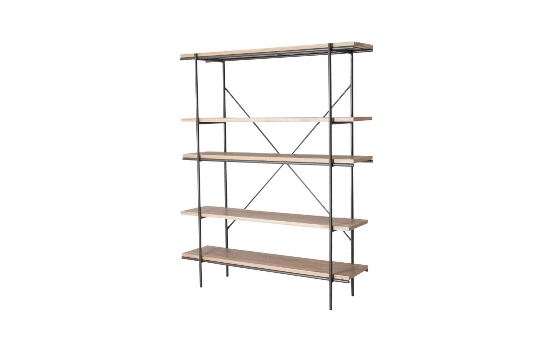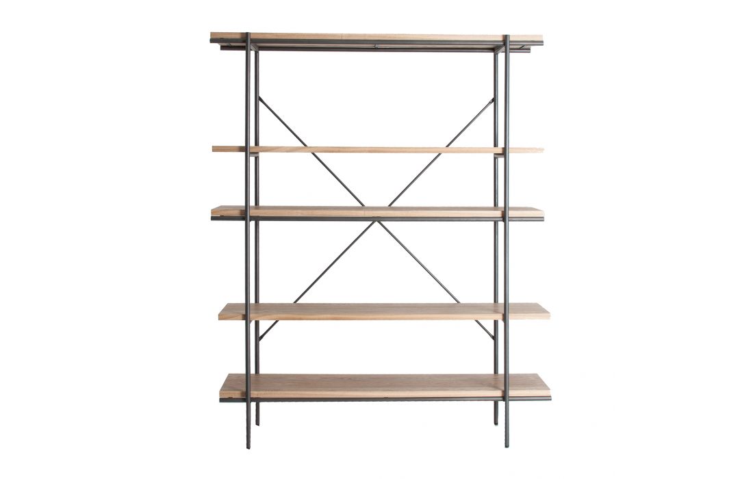 Livreiro feito com madeira de abeto e ferro, com quatro prateleiras e uma estrutura metálica