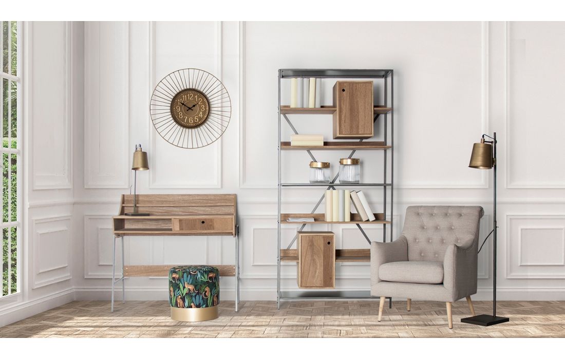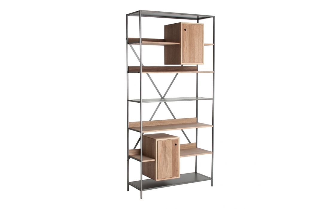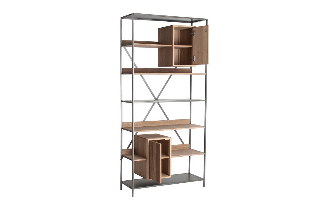 Livreiro em madeira de abeto natural e estrutura em ferro cinzento, com 6 prateleiras de madeira e metal e com 2 gavetas. Dimensões em cm L 95 P 38 A200
