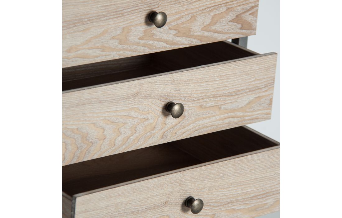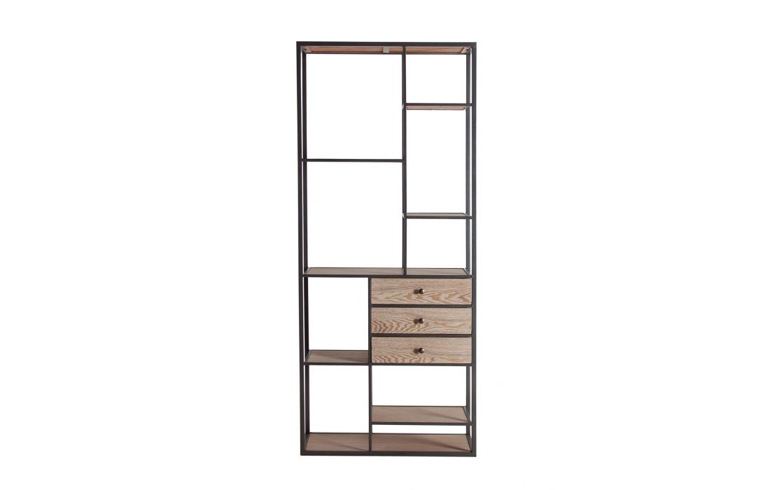 Livreiro em madeira de abeto natural e estrutura em ferro cinzento, com prateleiras de madeira e metal e com 3 gavetas.
