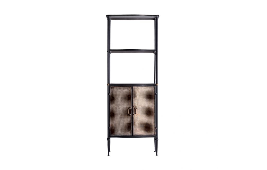 Livreiro composta por uma estrutura metálica de ferro em preto combinada com  cor dourada que protagoniza as duas portas do armário metálico em grelha