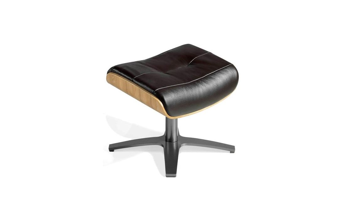 Banqueta giratória estofada nos vários revestimentos, com estrutura em nogueira e pés em aço inoxidável polido.