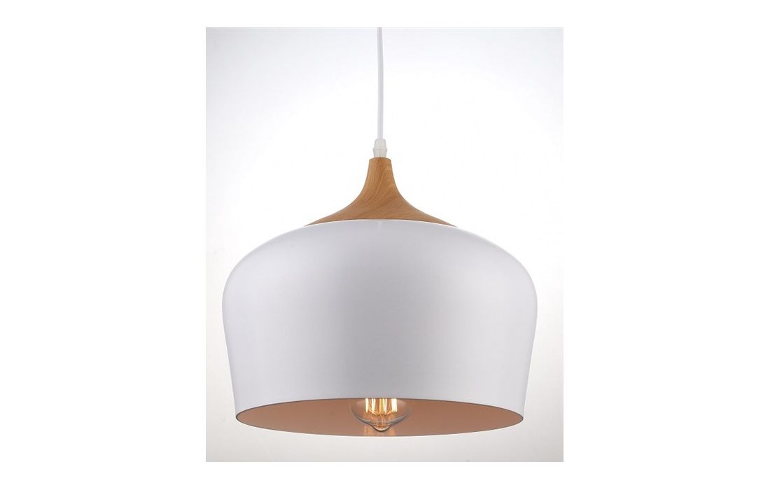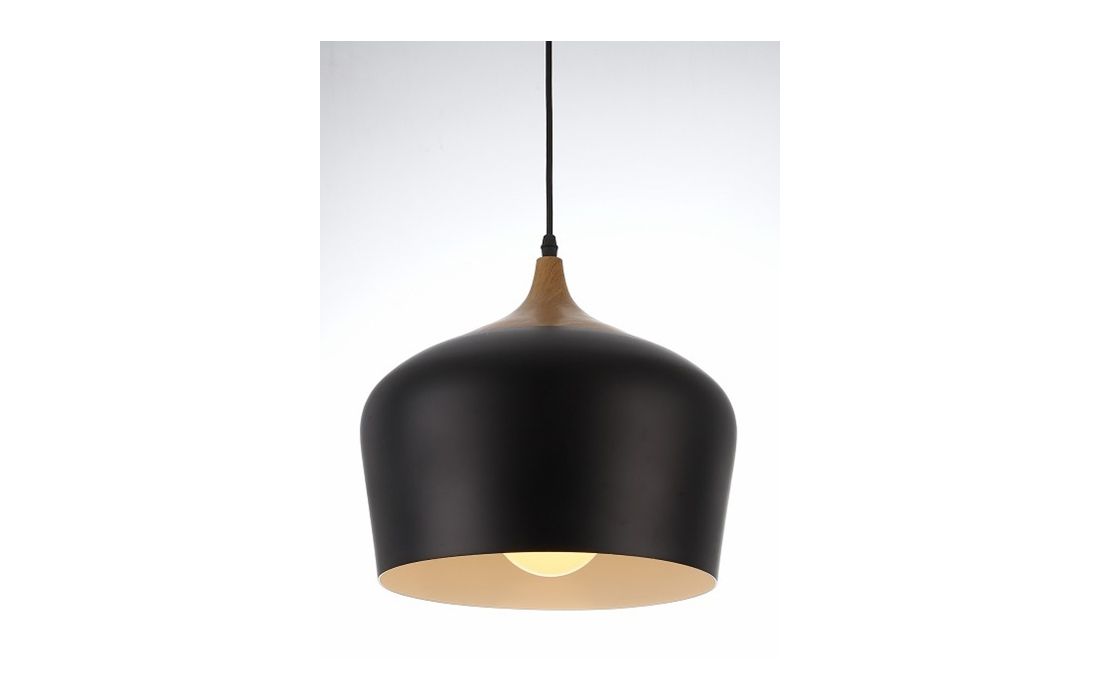 Candeeiro de teto com pormenor de madeira, abajur em metal preto ou branco.