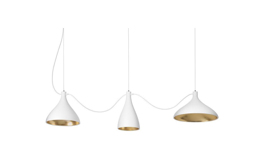 Candeeiro de teto com estrutura em metal branco, preto ou dourado, interior em dourado.