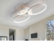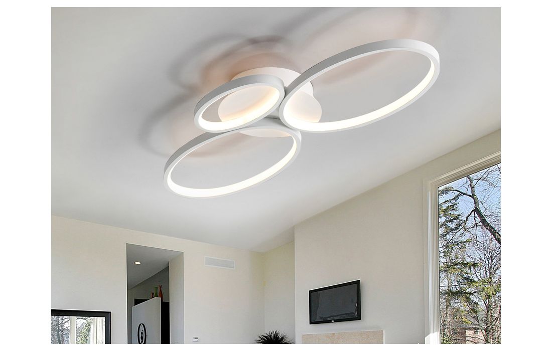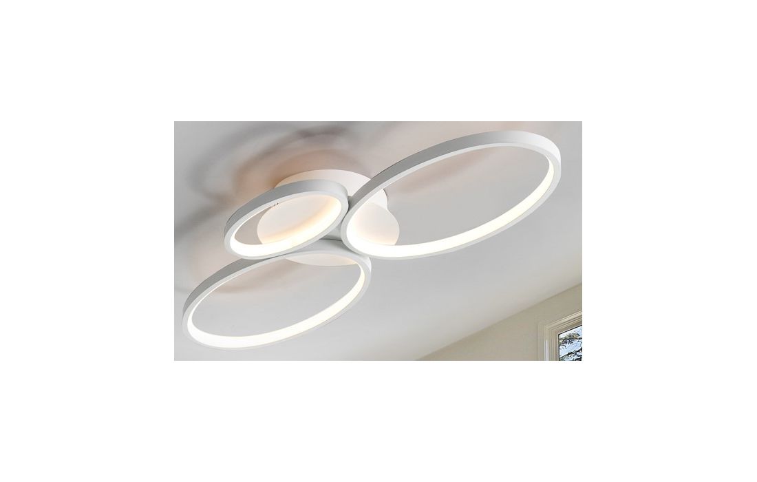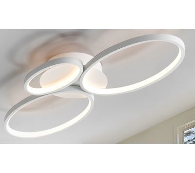 Candeeiro de teto formado por três lâmpadas ovais de luz, em metal e alumínio, acabamento branco lixado. Difusor de silicone.
