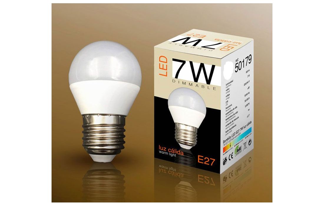 Lâmpada mini globo opalino LED REGULÁVEL de 7W. Luz cálida 3000K. 560 lúmens, equivalente a incandescente de 60W. Feixe de luz de 180°. Para casquilho E27.