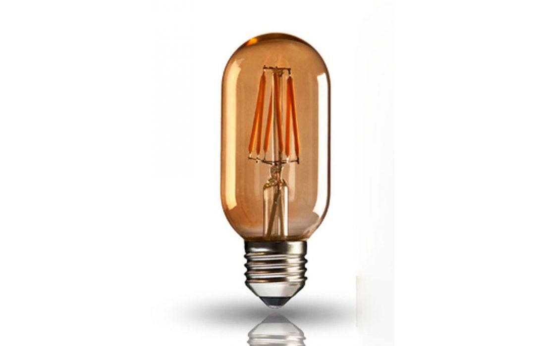 Lâmpada vintage LED regulável T45 6W. Luz cálida. Vidro de cor âmbar, filamento interior de LED. 400 lm. 2.480 K. Feixe de luz de 360°. Para casquilho E27.